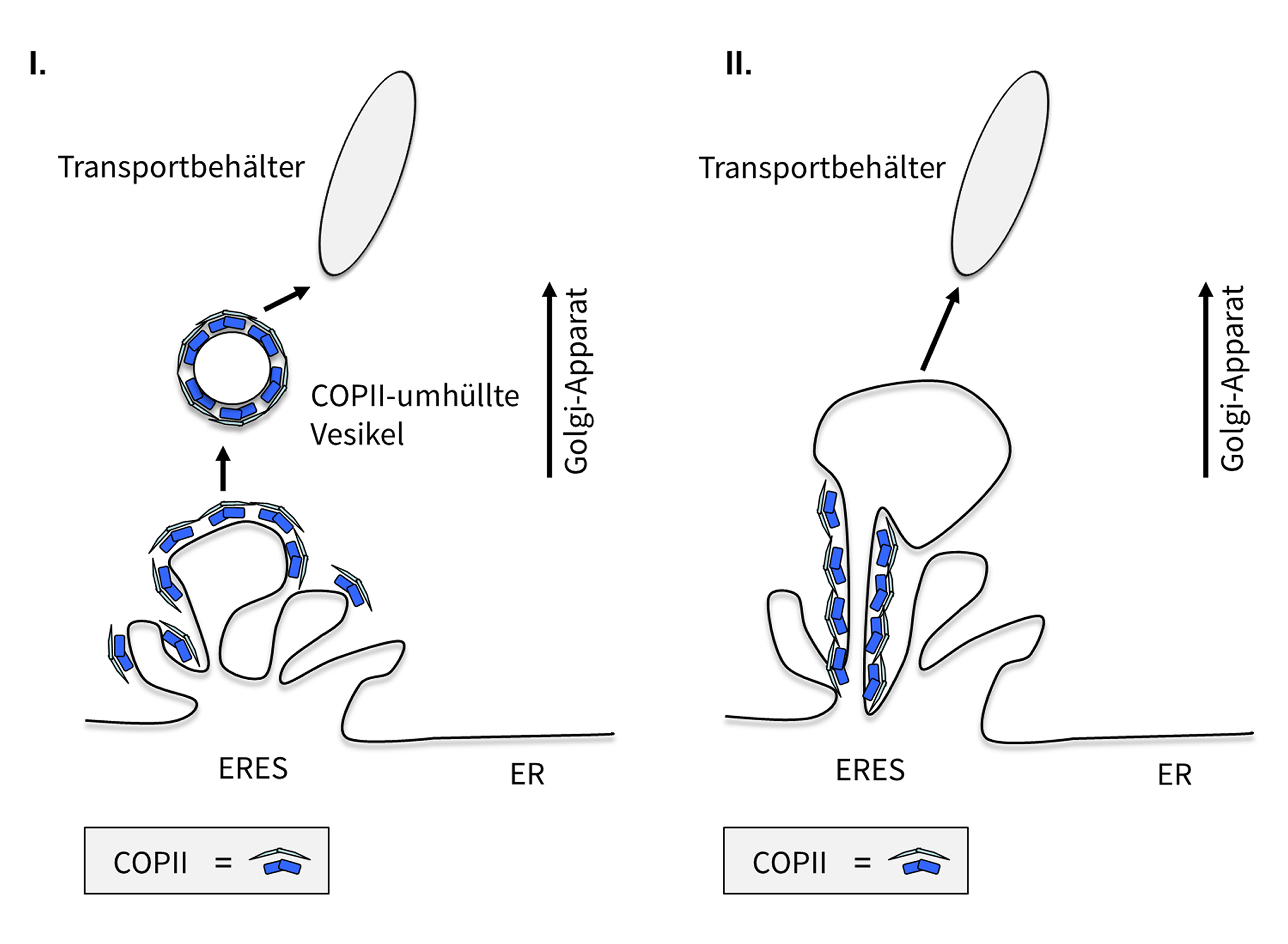 Die bis dato vorherrschende Ansicht in der Zellbiologie ist, dass sich durch Abschnürung (Abknospung) vom ER kleine Membranvesikel bilden, die mit den zu transportierenden Proteinen beladen werden. Diese Membranvesikel verbinden sich dann zu größeren Transportbehältern, die entlang sogenannter "Eisenbahnschienen", den Mikrotubuli in der Zelle, letztlich zum Golgi-Apparat transportiert werden. Dort verschmelzen diese Transportbehälter mit der Golgi-Membran und geben ihre Ware, die Proteine, zur weiteren Verteilung frei. Wichtig für diesen Prozess ist eine spezielle Hülle, die COPII-Hülle, die dabei hilft, zu Beginn des Transportes die Proteine am ER zu konzentrieren und in Membranvesikeln abzuknospen, die deshalb COPII-ummantelte Vesikel (Transportvesikel; (engl. coat protein complex II = „Mantel-Protein-Komplex II“) genannt werden. Doch dieses Wissen muss nun überarbeitet werden.
