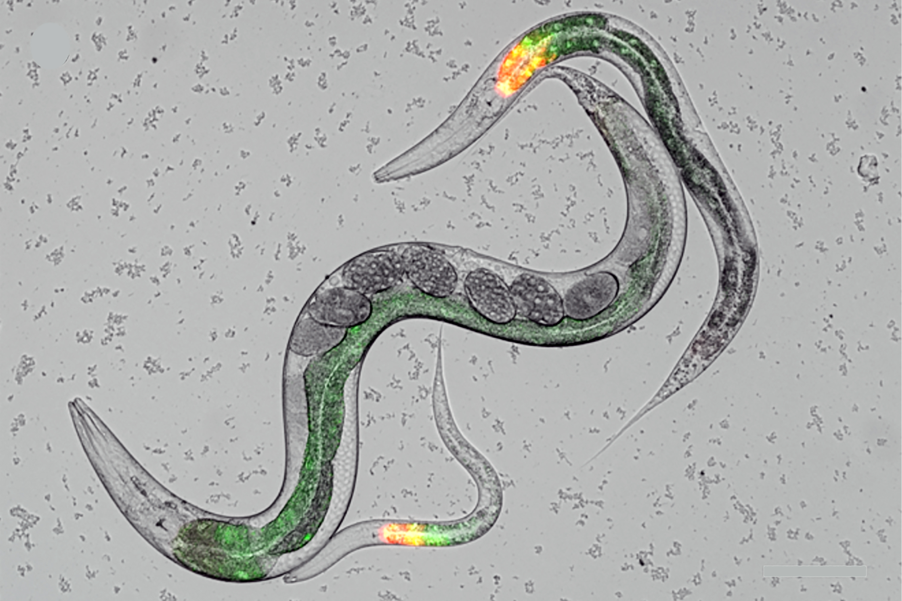 Bildunterschrift: In einer mikroskopischen Aufnahme des Fadenwurms ist die Expression von zwei clec Genen im Darm in grüner und roter Fluoreszenz markiert.