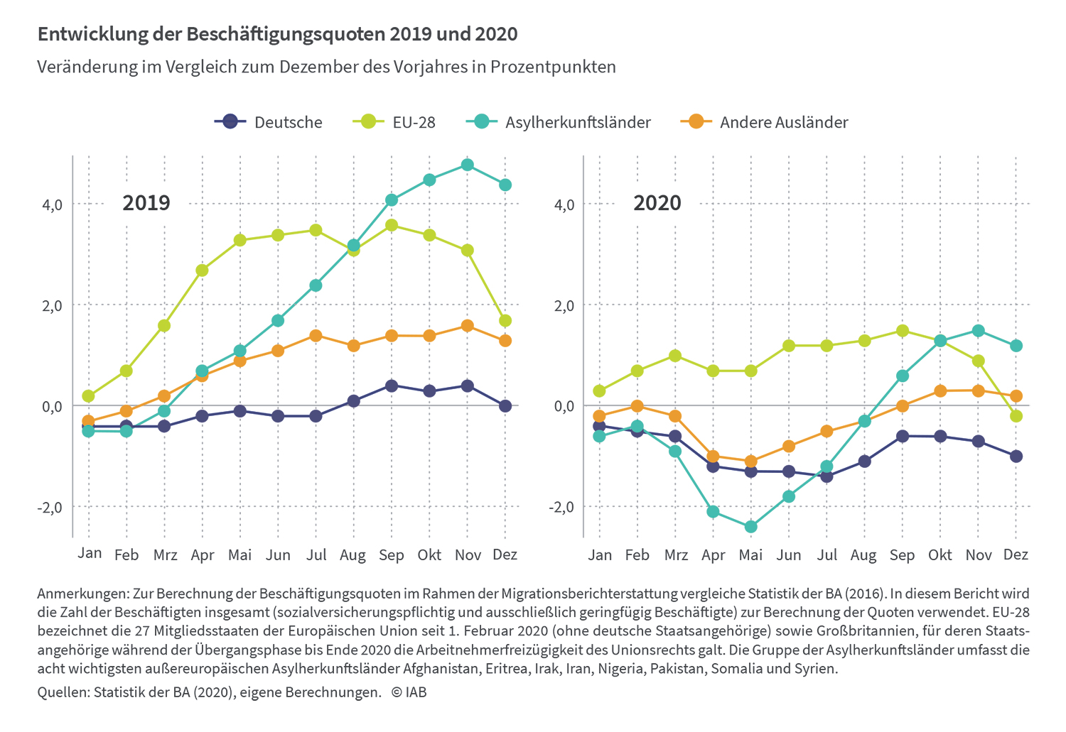 Die Beschäftigungsquote von Personen aus den Asylherkunftsländern lag im Dezember 2020 gegenüber dem Vorjahresmonat um 1,2 Prozentpunkte höher, bei den anderen Migrantengruppen blieb sie in etwa stabil. Bei den deutschen Staatsangehörigen sank sie um einen Prozentpunkt. Deutliche Unterschiede zeigen sich allerdings in der Entwicklung der Arbeitslosenquote. Mit einem Anstieg von 2,7 Prozentpunkten im Dezember 2020 im Vergleich zum Vorjahresmonat trifft das vor allem auf Staatsangehörige aus den Asylherkunftsländern zu. Das ist unter anderem darauf zurückzuführen, dass Maßnahmen wie Integrations- und Sprachkurse oftmals unterbrochen oder abgebrochen wurden. Bei Deutschen liegt der Anstieg der Arbeitslosenquote im Vergleich bei einem Prozentpunkt. „Insgesamt ist die sehr günstige Arbeitsmarktentwicklung bei den Migrantinnen und Migranten in den Vorjahren durch die Pandemie unterbrochen worden“, so IAB-Forscherin Lidwina Gundacker.