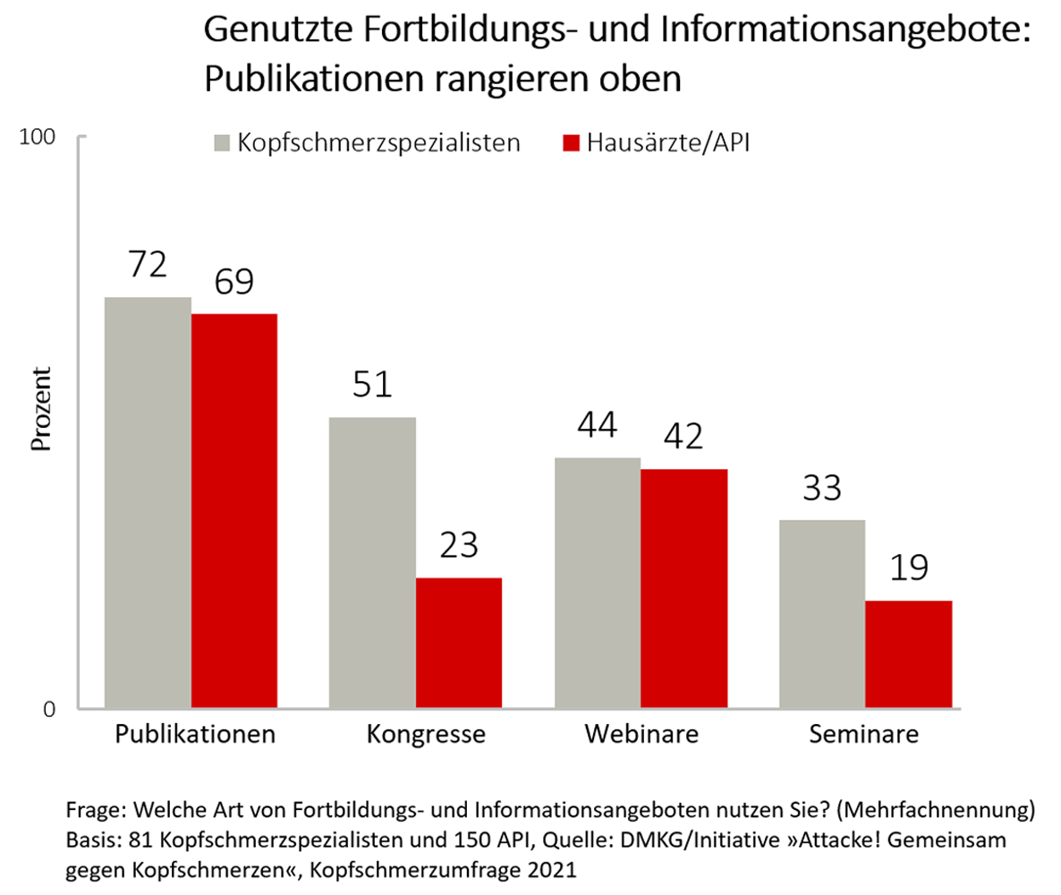Beide Arztgruppen wünschen sich vor allem zeitunabhängige digitale Fortbildungsangebote. Hausärzte begrüßen zudem Patienteninformationsmaterial in Form von Broschüren und Aufklärungsbögen sowie Informationsbroschüren und interaktive Wissensplattformen für die eigene Nutzung. Thematisch stehen bei API die Differentialdiagnostik von Kopfschmerzarten sowie Migräne bzw. Migräneprophylaxe im Vordergrund. Bei Spezialisten sind es die Themen nicht-medikamentöse Therapien, Therapie-Updates, neue Therapieformen und seltene Kopfschmerzarten.