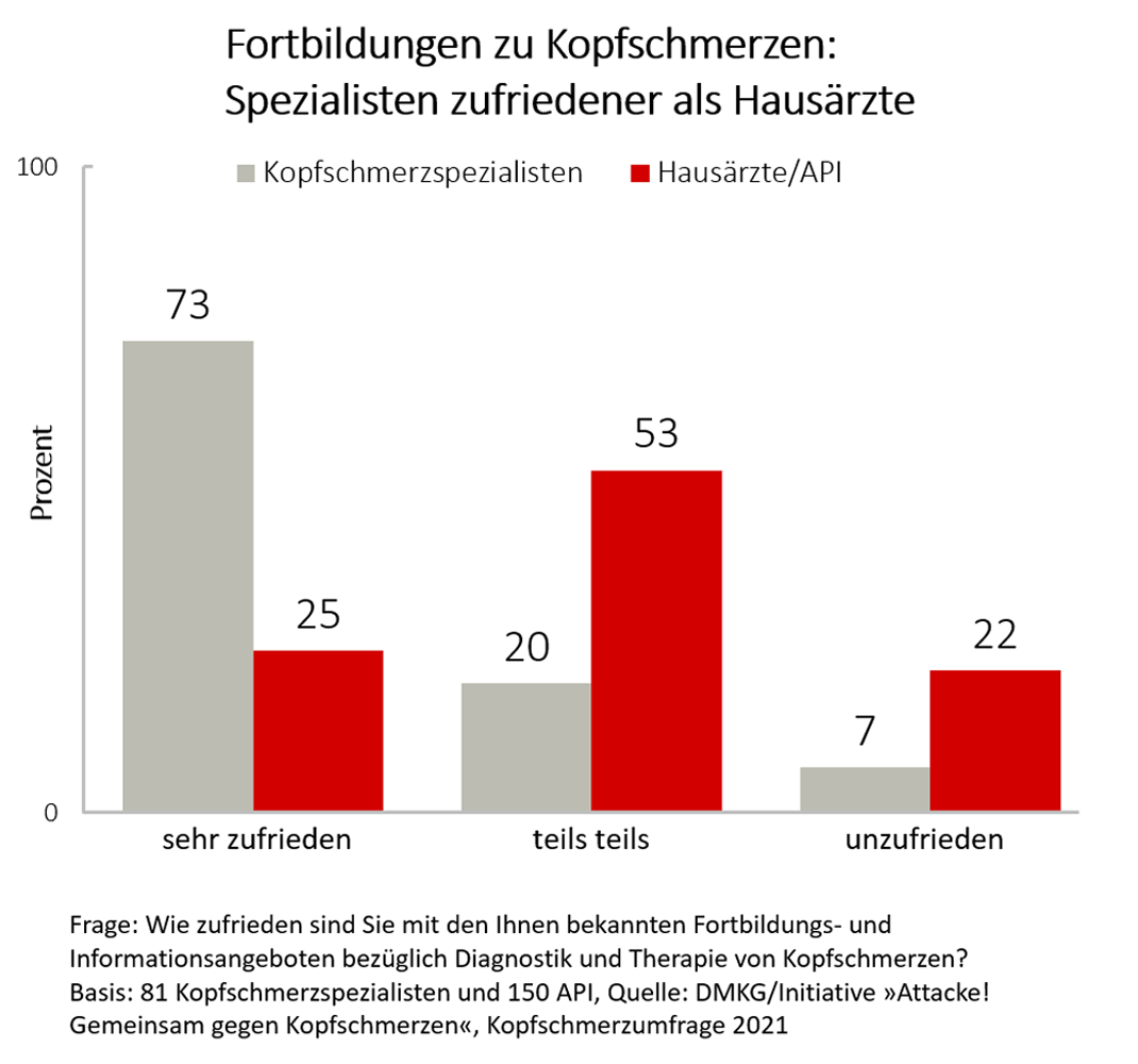 Drei Viertel der Kopfschmerzspezialisten schätzen das Fortbildungsangebot rund um das Thema Kopfschmerz als gut bis sehr gut ein. Lediglich 7 % sind eher unzufrieden. Unter Hausärzten ist dagegen nur ein Viertel mit den Fortbildungsmöglichkeiten zufrieden, ein weiteres Viertel gibt an, eher unzufrieden zu sein.