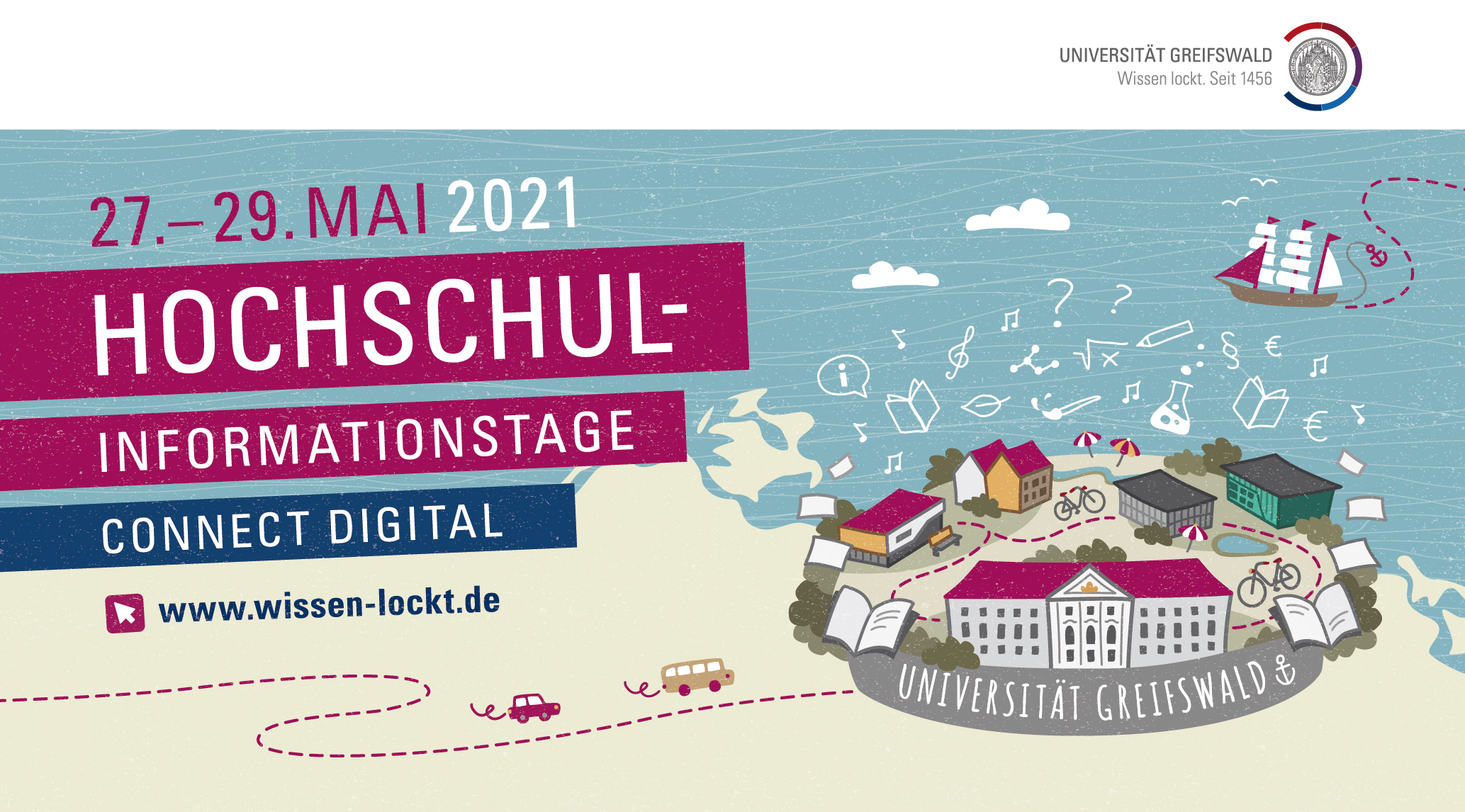 Finde, was dich sucht. Während der Hochschulinformationstage 2021 der Universität Greifswald wird vom 27. Mai bis zum 29. Mai 2021 ein Studium digital erlebbar. Die Entdeckungstour führt von der Vorstellung neuer Masterstudiengänge wie Medizinphysik über einen virtuellen Campus, der Teilnahme an der Online-Lehre bis zum persönlichen Austausch mit Studierenden. Das vollständige Programm gibt es unter www.wissen-lockt.de.