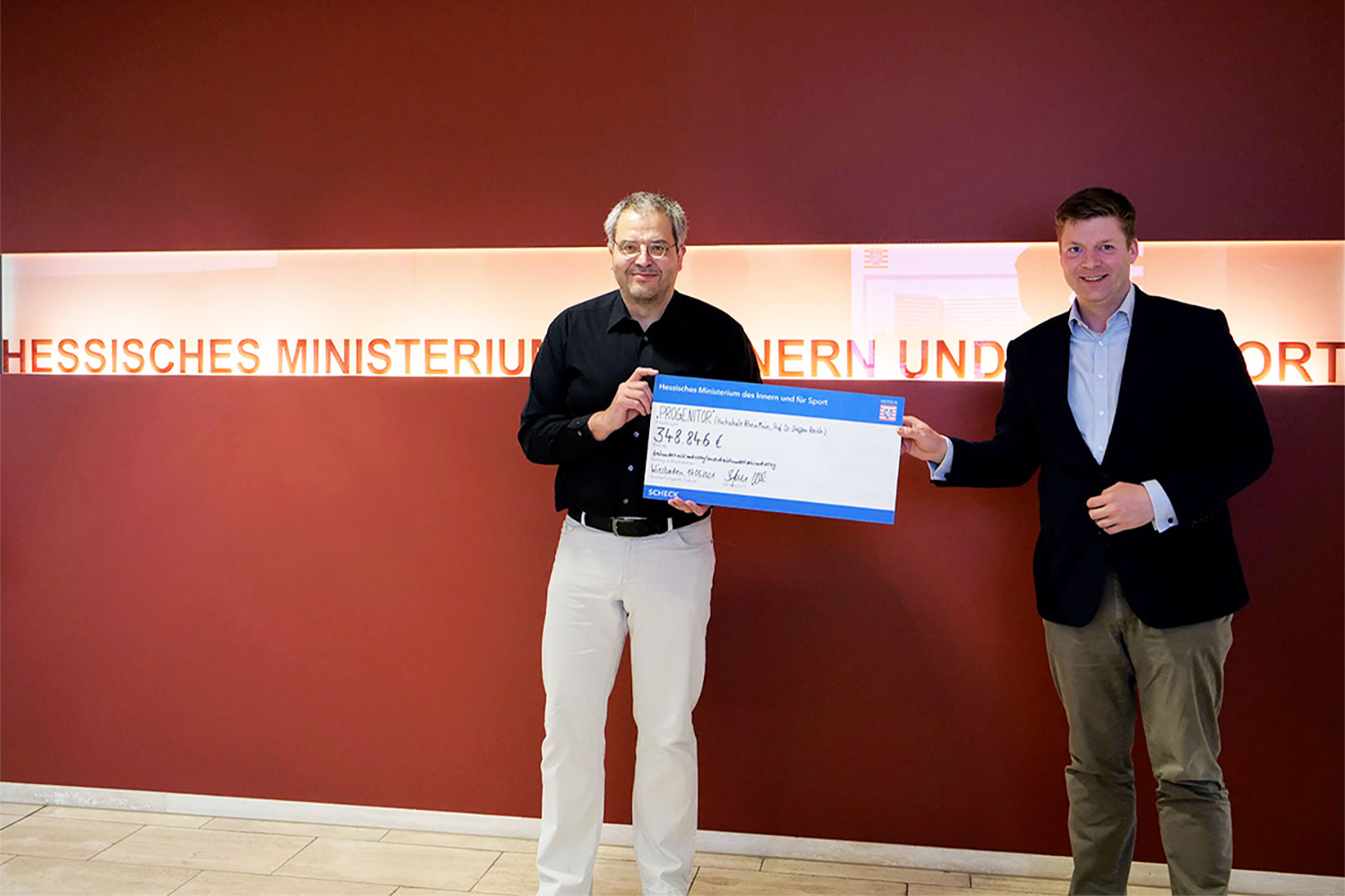 Das Hessische Ministerium des Innern und für Sport fördert im Bereich Cybersicherheit innovative Forschungsprojekte. Staatssekretär Dr. Stefan Heck überreichte heute Prof. Dr. Steffen Reith von der Hochschule RheinMain sowie Hochschulpräsidentin Prof. Dr. Eva Waller und Prof. Dr. Bodo Igler, Vizepräsident für Forschung & Entwicklung der HSRM, eine Förderzusage in Höhe von 350.000 Euro. Mit dem Geld wird das Projekt "PROGENITOR" unterstützt, welches die Entwicklung eines alltagstauglichen WLAN-Router-Prototypen vorsieht.