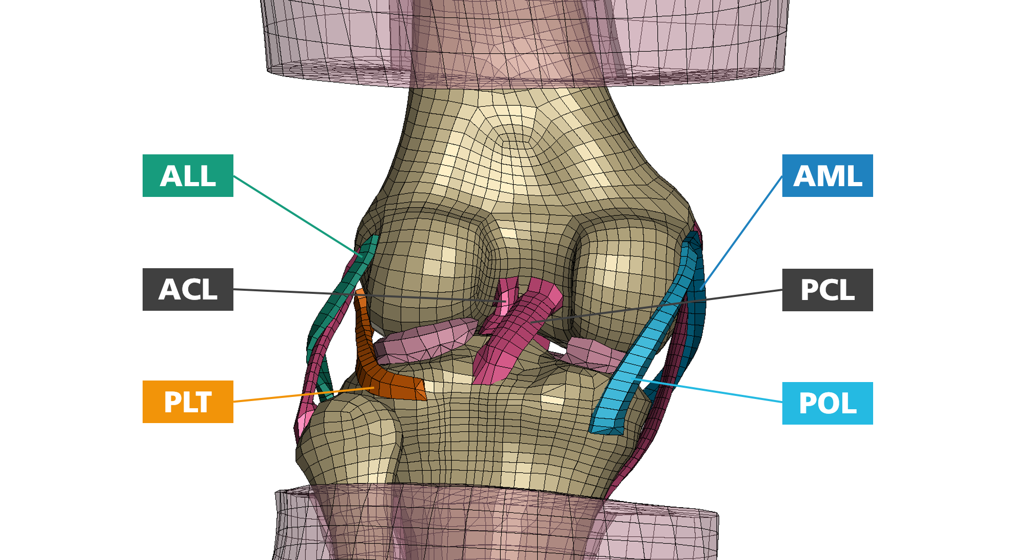 In der Studie wurden neben dem bereits erwähnten ALL noch drei weitere Ligamente untersucht. Es wurde herausgefunden, welche Ligamente unter welchen Bedingungen besonders starken Anteil bei der Unterstützung des VKB haben. Die vier Ligamente, die im Fokus der Untersuchung standen, mussten für die Studie zunächst in Absprache mit den Chirurgen geometrisch und konstitutiv dem Finite-Elemente(FE)-Modell hinzufügt werden, weswegen die Ergebnisse nicht einfach mit dem kommerziell erhältlichen Menschmodell nachsimuliert werden können. Die Ergebnisse der numerischen Analysen haben gezeigt, dass je nach Drehsinn der Rotation nicht nur das ALL, sondern auch noch weitere Ligamente daran beteiligt sind, das VKB durch die Aufnahme eigener Lastanteile zu stabilisieren.
