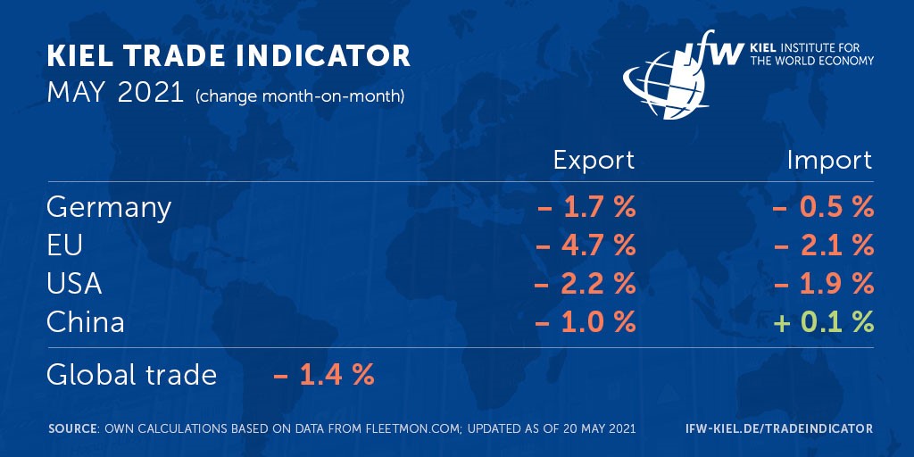 Kiel Trade Indicator, data update 5/20/2021: The months-long catch-up process in global trade is likely to be interrupted across a broad front in May for the first time in around a year. The Kiel Trade Indicator signals stagnation or a decline in imports and exports for Germany, the EU, the USA, China, and also global trade as a whole. It can therefore be assumed that shortages of certain goods will also continue for the time being.