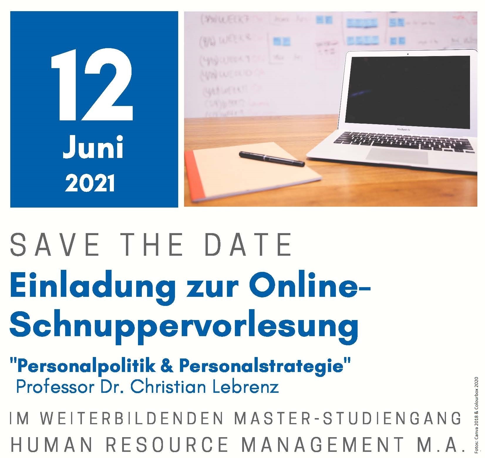 Wer mit dem Gedanken spielt, sich berufsbegleitend mit dem Fernstudium Human Resource Management (M.A.) weiterzuqualifizieren, hat jetzt die Gelegenheit an einer Live-Vorlesung teilzunehmen: Am Samstag, den 12. Juni können alle Interessierten an der Online-Veranstaltung „Personalpolitik & Personalstrategie“ mit Prof. Dr. Christian Lebrenz teilnehmen. Wer dabei sein möchte, erhält weitere Informationen bei Studiengangskoordinatorin Caroline Pfeifer: pfeifer@hs-koblenz.de.
