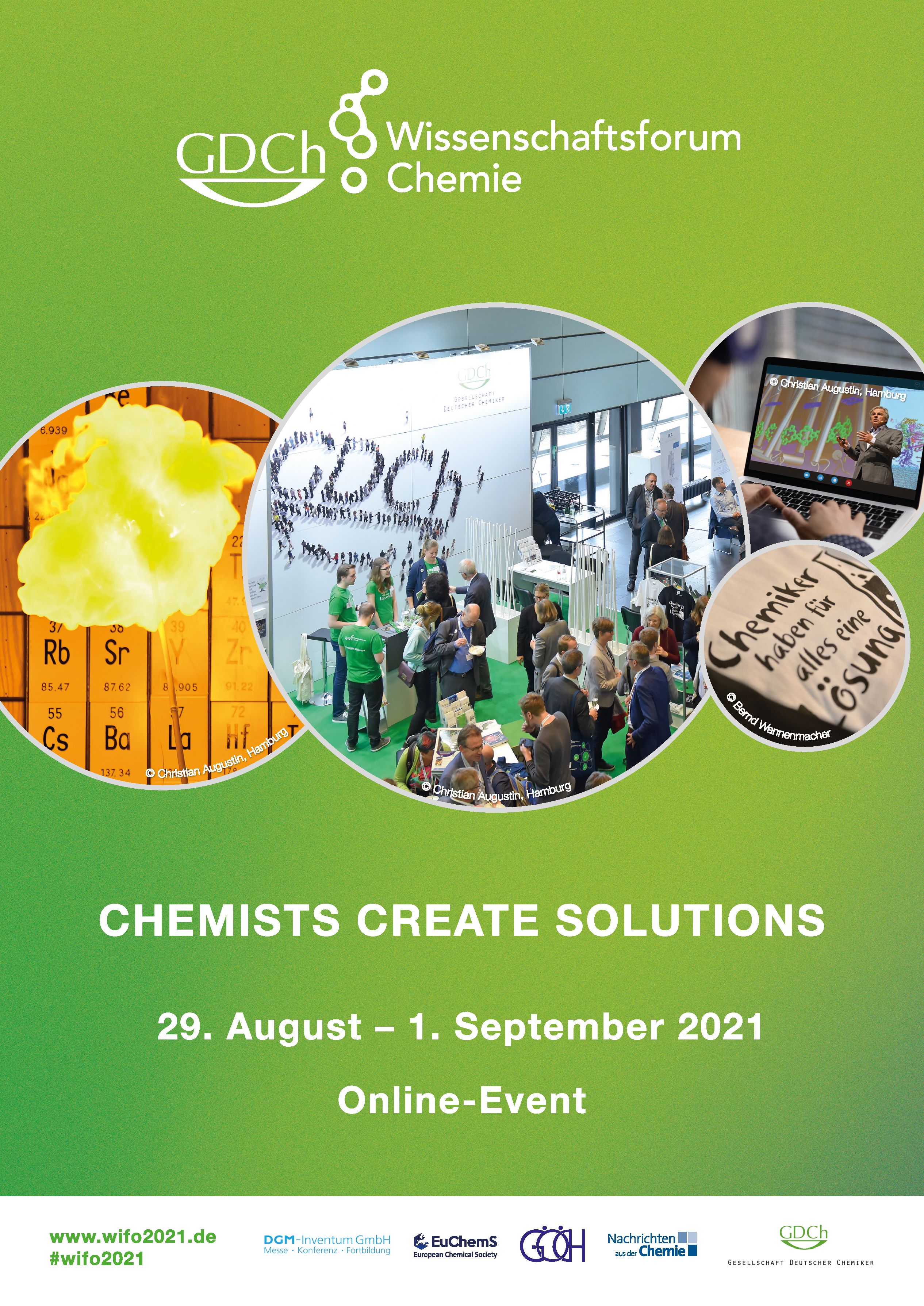 The GDCh Science Forum Chemistry 2021 will take place online under the slogan "Chemists create solutions" from August 29 to September 1. Participants can expect a varied program of plenary lectures, main symposia, a poster session and an industrial exhibition. Numerous prestigious awards will also be presented. Registration will be open from May 25 at https://www.wifo2021.de.