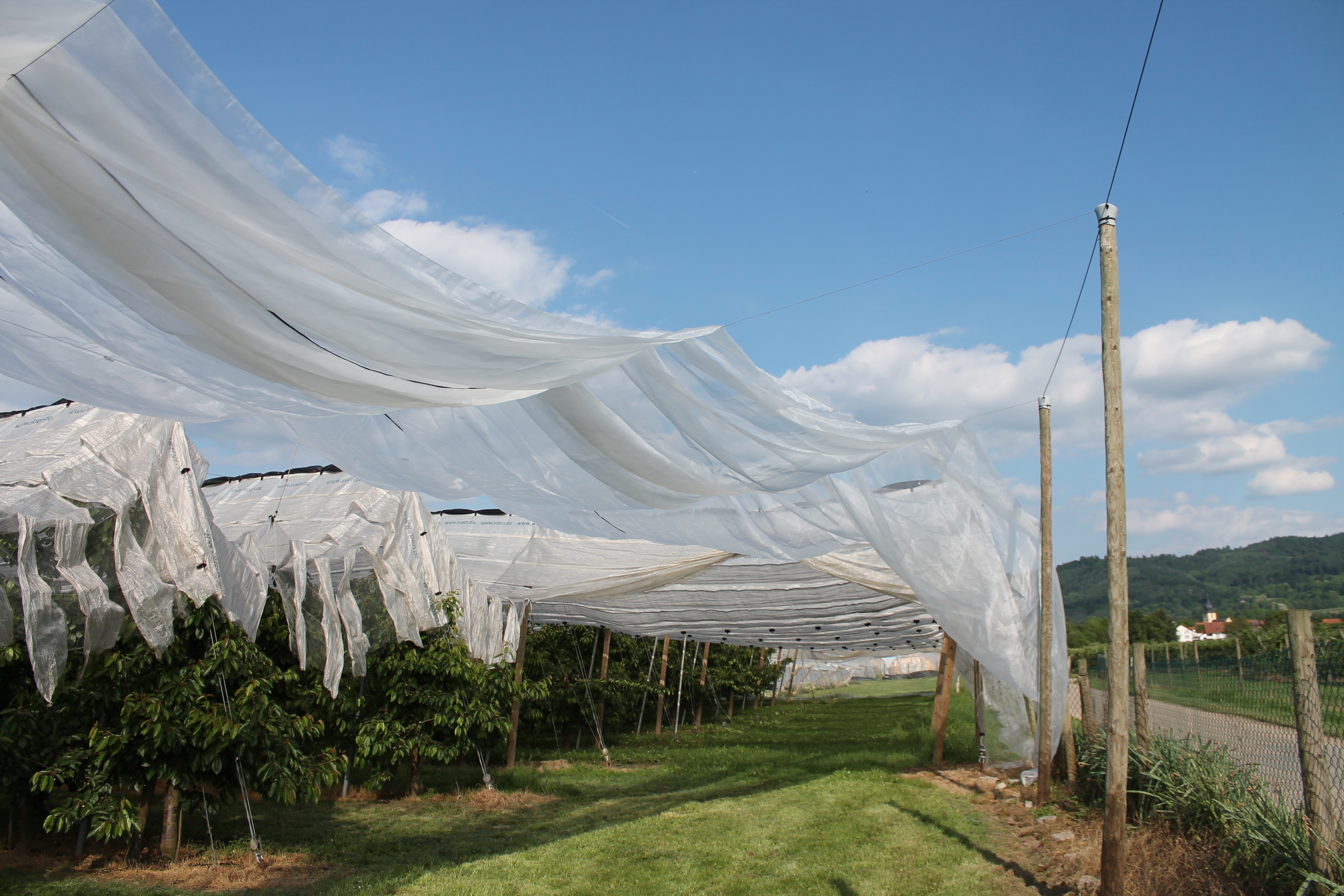 Obstkulturen werden mit Netzen gegen die Kirschessigfliege geschützt