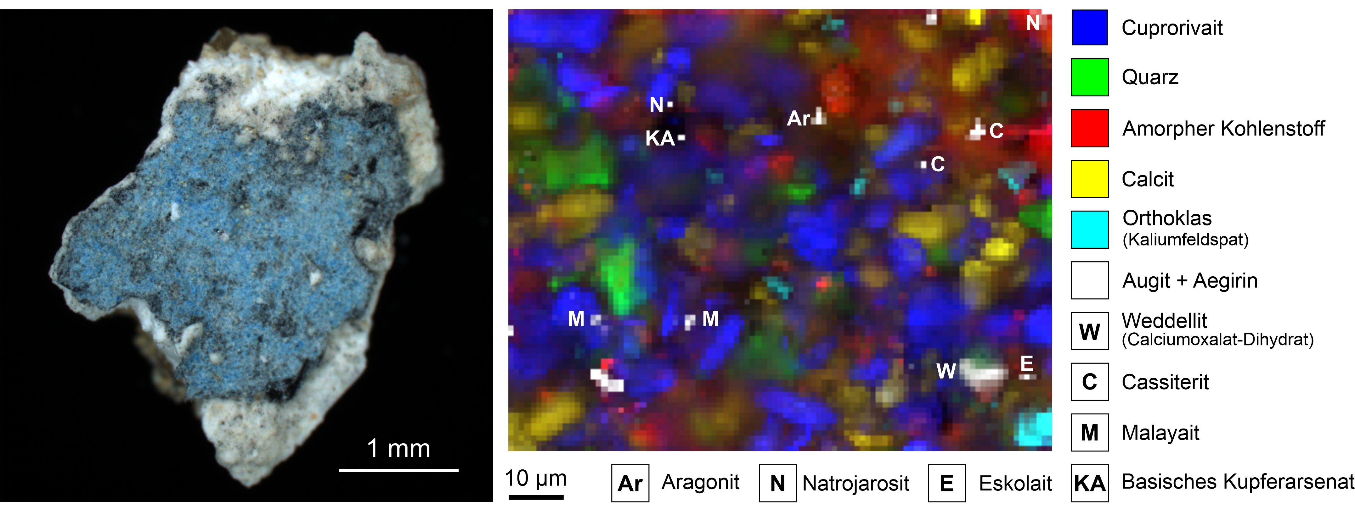 Für diffizile Untersuchungen von historischen Mörtelmaterialien setzte das Team bereits erfolgreich die Ramanmikroskopie zur Rekonstruktion von Prozessbedingungen und der Herkunft der Rohmaterialien ein. Aufgrund dieser Erfahrungen erschien die Anwendung dieser Technik auch für das Auffinden möglicher Spurenbestandteile in Ägyptisch Blau vielversprechend. Dabei wurde die Malschicht auf dem Bruchstück flächendeckend mit einem auf etwa ein Tausendstel Millimeter gebündelten Laserstrahl abgetastet und an jedem Messpunkt eine zerstörungsfreie Mineralienbestimmung durchgeführt, sodass selbst kleinste Informationsträger gefunden werden konnten.