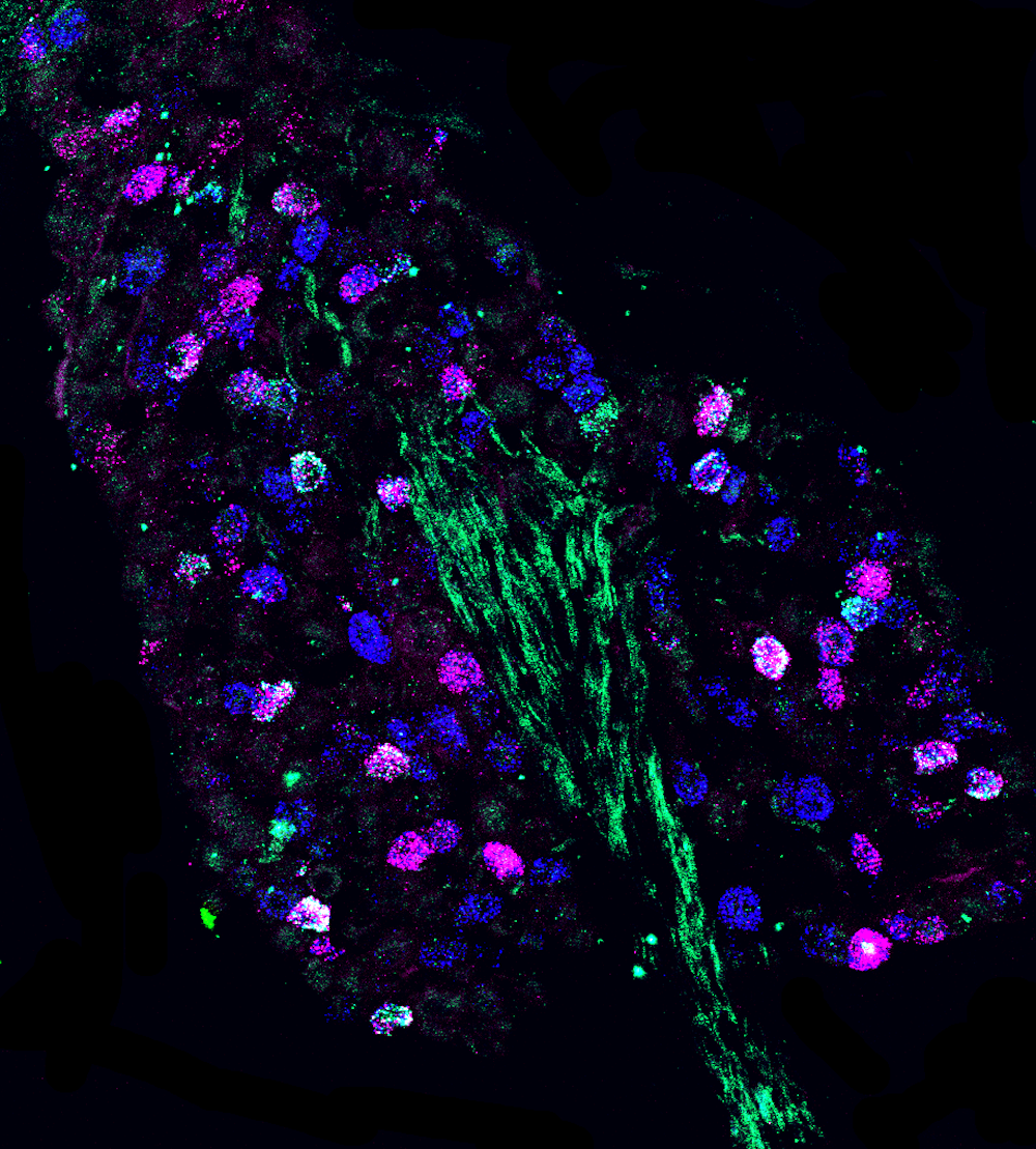 When we consume food, information about the ingested food is transmitted from the gastrointestinal tract to the brain in order to adapt feelings of hunger and satiety. Based on this information, the brain decides, for example, whether we continue or stop eating. In addition, our blood sugar level are adapted by the brain. The vagus nerve, which extends from the brain all the way down to the gastrointestinal tract, plays an essential role in this communication. In the control center of the vagus nerve, the so-called nodose ganglion, various nerve cells are situated, some of which innervate the stomach while others innervate the intestine. Some of these nerve cells detect mechanical stimuli in the different organs, such as stomach stretch during feeding, while others detect chemical signals, such as nutrients from the food that we consume. But what roles these different nerve cells play in transmitting information from the gut to the brain, and how their activity contributes to adaptations of feeding behavior and blood sugar levels had remained largely unclear.
