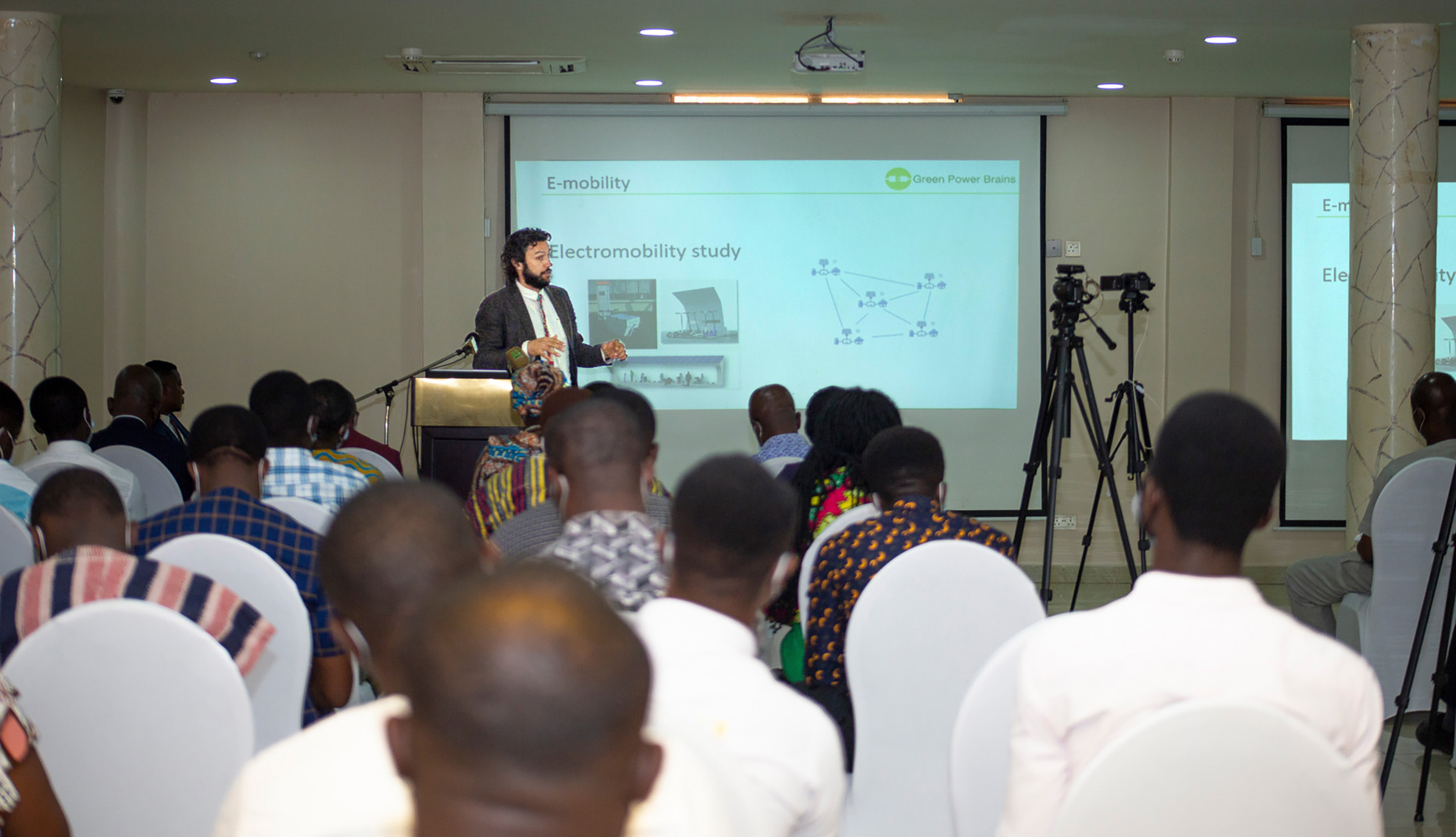 Im Anschluss stellte Dr.-Ing. Sebastian Finke, Wissenschaftlicher Mitarbeiter des Labors für Nachhaltigkeit in der Technik, die Ergebnisse der Lebenszyklusanalyse eines Solar-Mini-Grids vor. Hierbei verglich er die Umweltwirkung durch die Energieversorgung von Cargo-Bikes durch den nationalen Strom-Mix mit der Nutzung eines Mini-Grids. Die Vorteile der Solarenergie betonte auch Finkes Kollege Frederick Adjei. Als weiterer Partner des Labors präsentierte außerdem Michele Velenderic vom Unternehmen Green Power Brains das Potenzial dezentraler Energieversorgungssysteme zur Gewährleistung einer sicheren Stromversorgung.