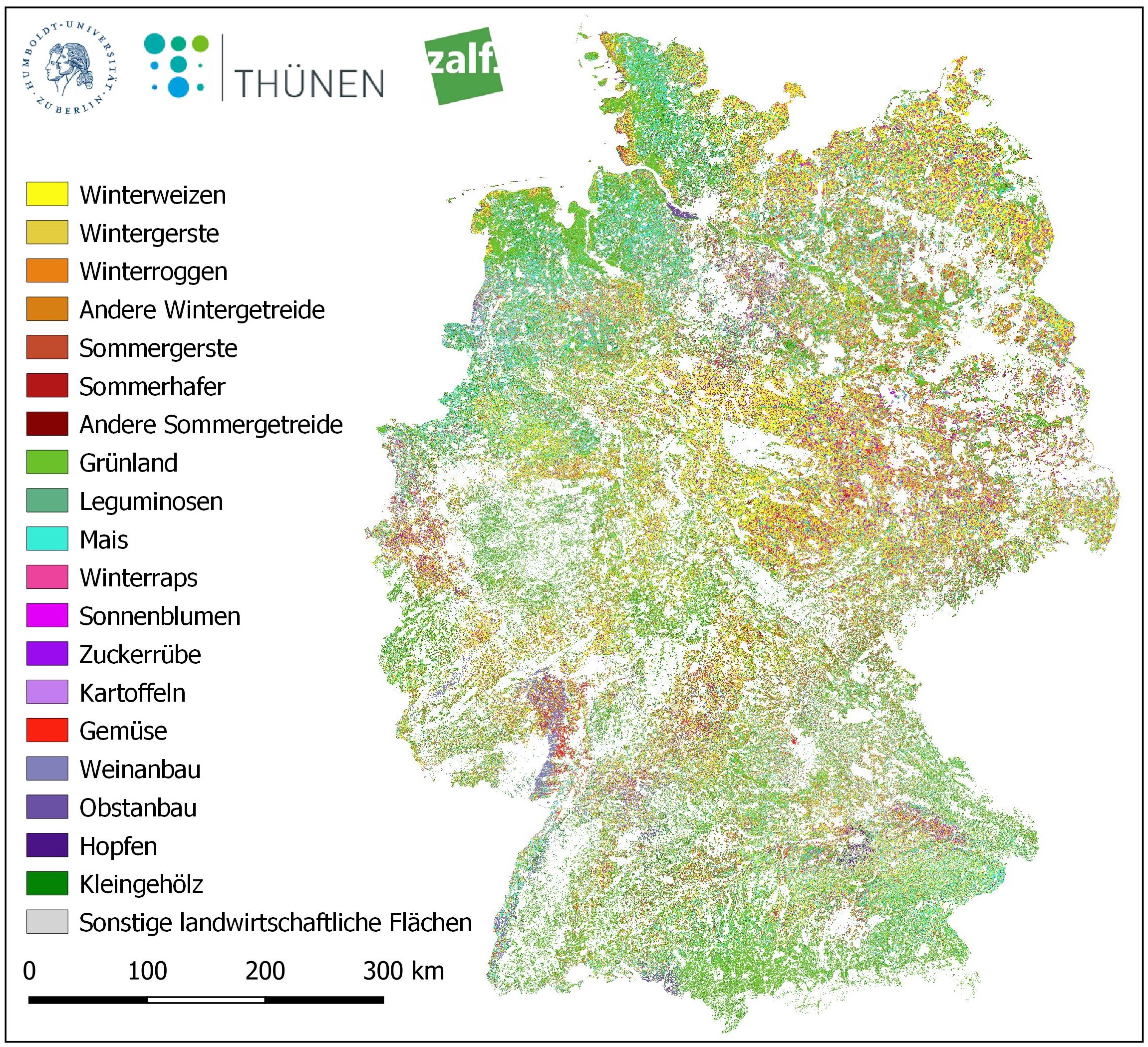 Für die Kartenerstellung nutzten die Wissenschaftlerinnen und Wissenschaftler Verfahren des maschinellen Lernens, verfügbare Informationen zur bisherigen Flächennutzung der Landwirte und Daten der US-amerikanischen Satellitenmission Landsat 8 sowie des Copernicus-Programms der europäischen Weltraumbehörde (ESA), deren Satelliten seit 2016 die Erde umkreisen. Um regionale Besonderheiten sowie saisonale und jahresbedingte Schwankungen zu berücksichtigen, wurden weiterhin Wetterdaten des Deutschen Wetterdienstes sowie das deutschlandweite Höhenmodell und das Digitale Landschaftsmodell des Bundesamtes für Kartographie und Geodäsie (BKG) einbezogen.