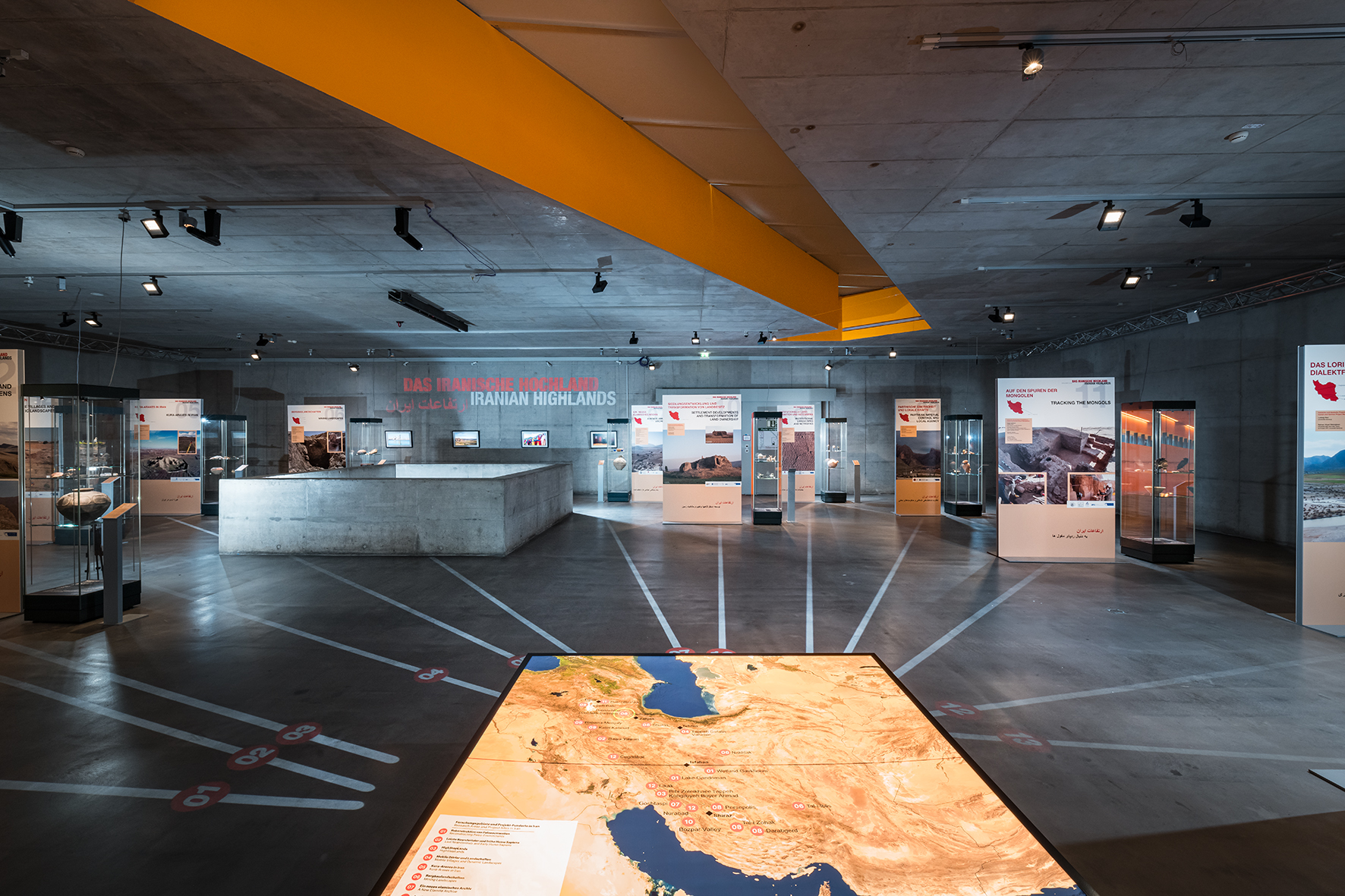 In 13 Stationen widmet sich die Ausstellung mit zahlreichen archäologischen Funden und Medieninstallationen den Projekten des Forschungsprogramms. Steinwerkzeuge erzählen etwa aus der Altsteinzeit, als noch der Neandertaler durch das iranische Hochland streifte. Funde legen zum Beispiel nah, dass Neandertaler und moderne Menschen zur gleichen Zeit gemeinsam einen Höhlenvorsprung nutzten. Sie teilten sich bis zu 5.000 Jahre die Landschaft und pflanzten sich sogar gemeinsam fort, bis der Neandertaler ausstarb. Ein anderes Projekt zeigt, wie vor etwa 7.000 Jahren wiederholt Flüsse über ihre Ufer traten und Siedlungen überschwemmten. Die Menschen mussten ihr Zuhause aufgeben, um es an anderer Stelle wiederaufzubauen.