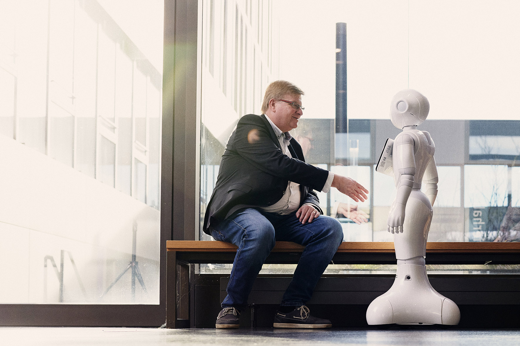 Ein weiteres Beispiel ist die Entwicklung von Pflegerobotern. Dabei muss bereits zu Beginn geklärt werden, ob es ethisch überhaupt vertretbar ist, Menschen von Robotern pflegen zu lassen und wenn ja, welche rechtlichen und ethischen Voraussetzungen erfüllt sein müssen, damit eine solche Maschine in weiten Bereichen menschliche Arbeitskraft ersetzen kann. Der Roboter „Pepper" vom Fachbereich Ingenieurwissenschaften und Mathematik diente als Accessoire für das Fotoshooting. Doch auch wenn solche „Social Robots" wie Pepper freundlich und niedlich aussehen und mit dem Menschen sprechen können, ist es nicht wünschenswert, wenn sie uns einengen, bevormunden oder als Datenlieferanten womöglich sogar gefährden. Durch die Einbindung in Lehrveranstaltungen sollen Studierende befähigt werden, bei der Technikentwicklung nicht „am Menschen vorbei zu planen“. Durch die Einbindung in Lehrveranstaltungen sollen Studierende befähigt werden, bei der Technikentwicklung nicht „am Menschen vorbei zu planen“.