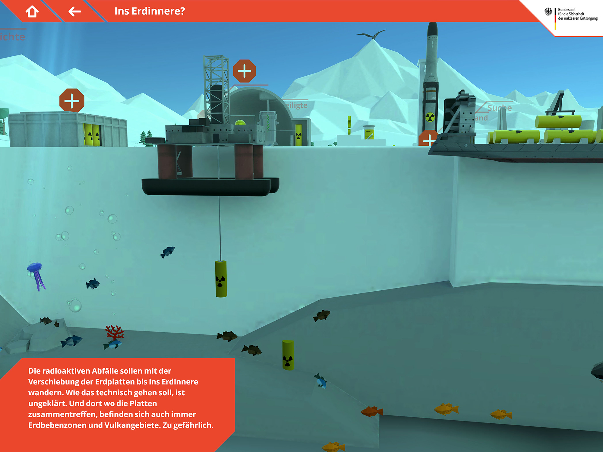 In der App „endlagersuche:360°“ bewegen sich Nutzerinnen und Nutzer durch eine 3D-Welt. Alle Themen sind grafisch, zum Teil spielerisch aufbereitet. Interessierte können zum Beispiel ein Zwischenlager für hochradioaktive Abfälle besuchen. Ein futuristisches Labor informiert über Radioaktivität. Interaktive Grafiken erläutern das Suchverfahren und die Bürgerbeteiligung.