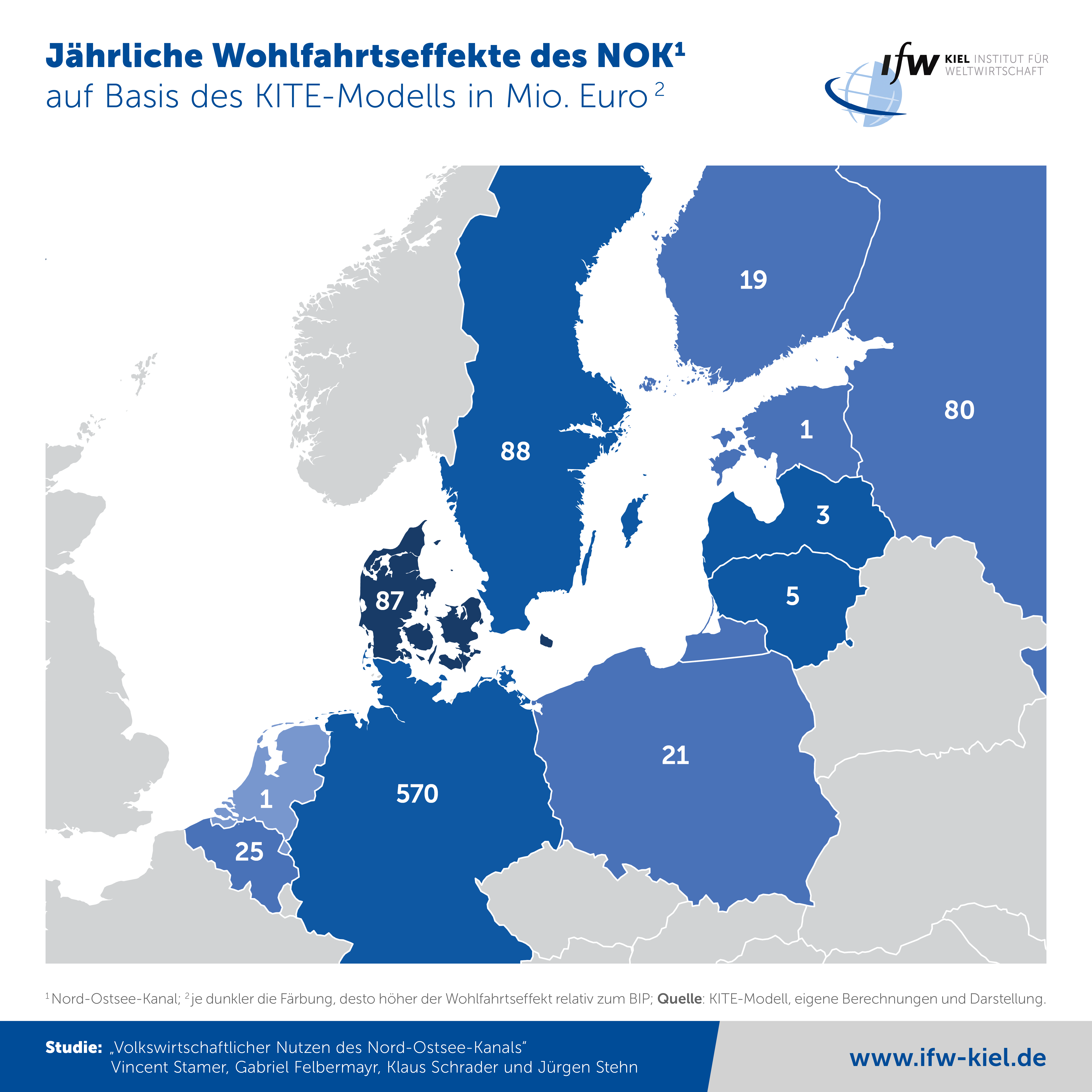 Der positive, gesamtdeutsche Wohlfahrtseffekt durch den Nord-Ostsee-Kanal (NOK) beruht vor allem auf seiner Funktion als Verkehrsachse. Durch kürzere Wege zu den Anrainerstaaten der Ostsee reduziert er die Handelskosten für Exporteure und Importeure deutlich. Deutschland profitiert durch den NOK mit rund 570 Millionen Euro pro Jahr, davon sind gut 140 Millionen Euro Einnahmen von Beschäftigten und Firmen mit direktem NOK-Bezug. Es folgen Dänemark mit 87 und Schweden mit 88 Mio. Euro. Relativ zum Bruttoinlandsprodukt profitiert Dänemark am stärksten. Die Berechnungen sind Teil einer Studie des IfW Kiel im Auftrag der Initiative Kiel-Canal e.V. (Stamer, Felbermayr, Schrader, Stehn: „Volkswirtschaftlicher Nutzen des Nord-Ostsee-Kanals“/https://www.ifw-kiel.de/index.php?id=16199&L=1).