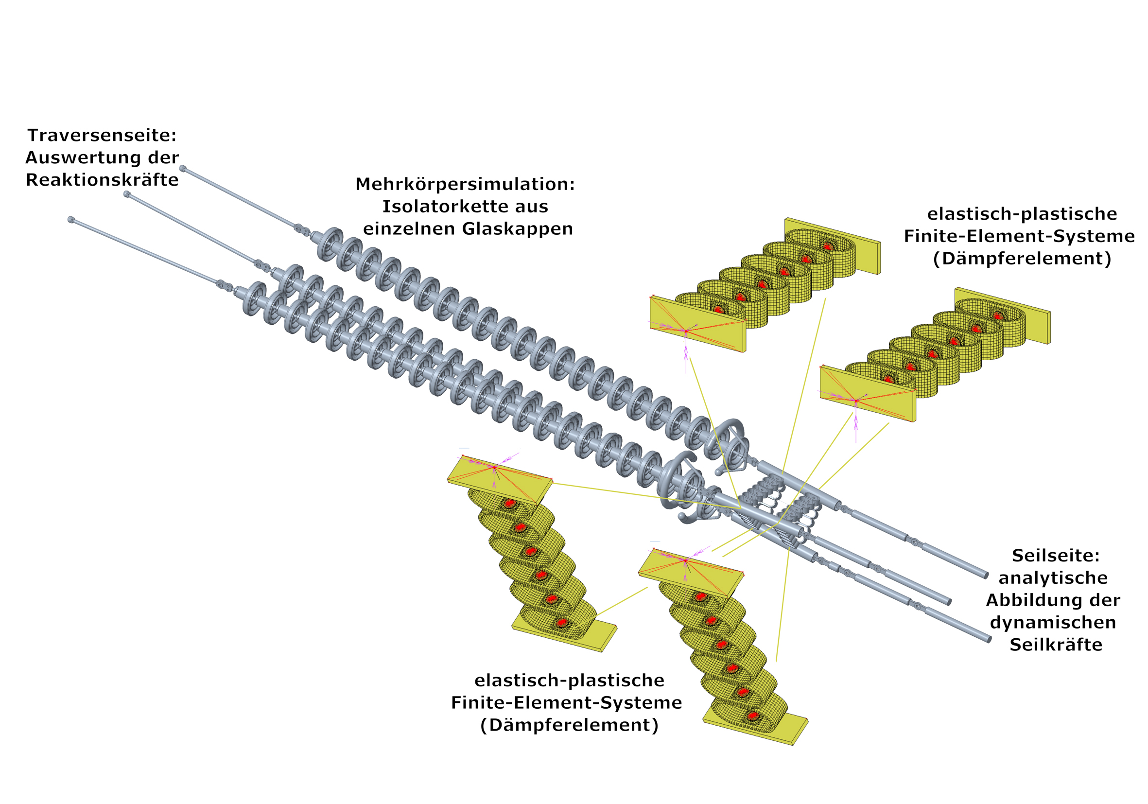 Es waren die weltweit ersten Untersuchungen dieser Art. Bisher wurden solche Simulationen nur sehr vereinfacht durchgeführt. Plastische Verformungen wurden vernachlässigt oder gar nicht abgebildet, da alle Bauteile bisher relativ steif waren. „Aufgrund des dritten Isolatorenstranges und des Dämpferelements mussten wir uns erstmals in den dreidimensionalen Bereich begeben und zwei Simulationsmethoden miteinander koppeln; ein Detailniveau, das softwareseitig und aufgrund der notwendigen Rechnerleistung erst seit wenigen Jahren überhaupt möglich ist“, erklärt Landschützer und schildert die weiteren Herausforderungen: „Um die Lastumlagerung vollständig abbilden zu können, mussten wir ein Mehrkörpersimulationsmodell sowie Modelle nach der Finite-Element-Methode (numerisches Verfahren zur Berechnung des Strukturverhaltens einzelner Objektbereiche, Anm.) erstellen und diese dann miteinander koppeln, damit sie zeitsynchron den hochdynamischen Vorgang (dieser dauert nur ca. 0,2 Sekunden) berechnen können.“ Einerseits wurden die Seildynamik und das Bewegungsverhalten der Isolatorenstränge modelliert. Andererseits wurde die plastische Verformung des Dämpferelements abgebildet. Und das Team des Instituts für Technische Logistik hat zu jeder einzelnen Kette den Bruch aller drei Isolatorstränge, sowohl auf der Mast- als auch auf der Seilseite simuliert.