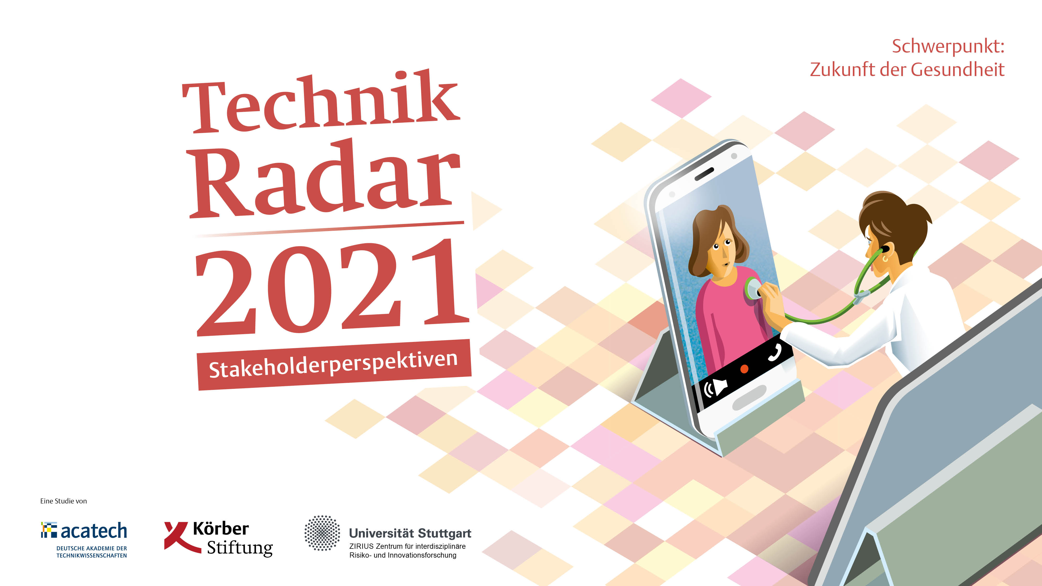 Elektronische Patientenakte, Telemedizin, digitale Vernetzung der Akteure: Deutschland steigt großflächig in die Digitalisierung des Gesundheitssystems ein. Was die betroffenen Stakeholder von der digitalen Transformation erwarten, wie sie die Chancen und Risiken bewerten und welche Zielkonflikte es gibt, untersucht das TechnikRadar 2021 von acatech – Deutsche Akademie der Technikwissenschaften, der Körber-Stiftung und dem Zentrum für Interdisziplinäre Risiko- und Innovationsforschung der Universität Stuttgart (ZIRIUS).