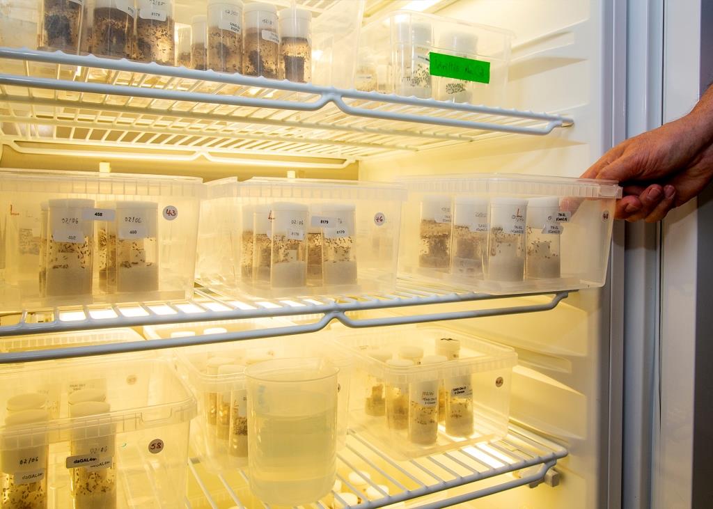 Das Foto zeigt Zuchtgefäße für die Taufliege Drosophila in einem Brutschrank. An den Wänden der runden Brutgefäße sieht man weiße längliche Larven und adulte Fliegen sitzen. Die weiße Masse am Boden ist ein spezielles Zuchtmedium, in das die adulten Fliegen Eier legen und in dem die Fliegenlarven fressen bis diese dann zur Verpuppung aus dem Futter heraus nach oben kriechen.