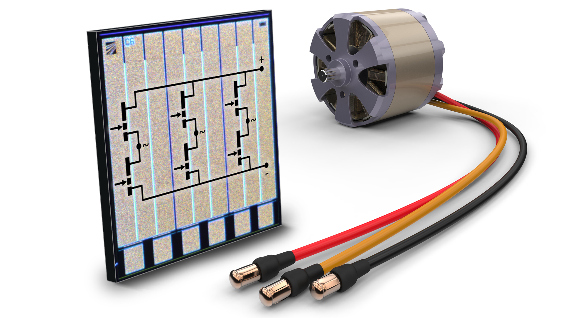 In addition to single transistors, commercial GaN low-voltage half-bridge ICs are already available. These half-bridge ICs integrate two power transistors in one chip, but only side-by-side, which does not yet capitalize on the full potential. Fraunhofer IAF has now managed to interleave both half-bridge transistors at the smallest structural level, which further improves efficiency and integrated three of these half-bridge structures into a 3-phase motor inverter GaN IC. The developer of the motor inverter GaN IC, Stefan Mönch of Fraunhofer IAF, explains the advantages that result from this interleaved structure: “The intrinsic half-bridge improves the electrical switching properties, and all three phases in the same IC reduce the temperature swing during motor operation. Only one IC is also more cost-efficient and easier to build than six transistors or three half-bridges previously needed for a GaN-based motor inverter.”