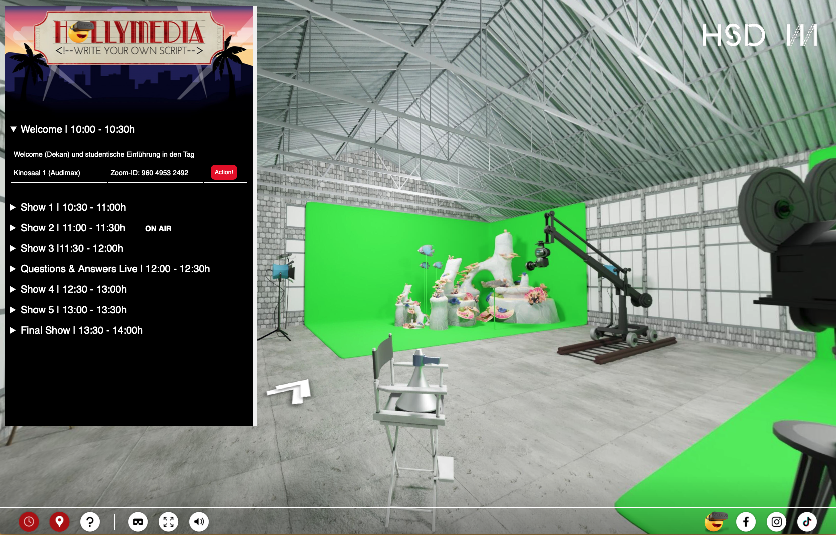 Besucherinnen und Besucher können mit ihren Handys, Tablets, Computern oder mit VR-Brille die Räumlichkeiten der Hochschule bequem von zu Hause aus erkunden. In den virtuellen Kinosälen kann man sich live Kurzvorlesungen und Präsentationen aus der Praxis anschauen, an Studioführungen teilnehmen und vieles mehr erleben! So werden beispielsweise fiktive Filmsets in Hörsälen untergebracht und der Audimax wird zum Großraumkino.