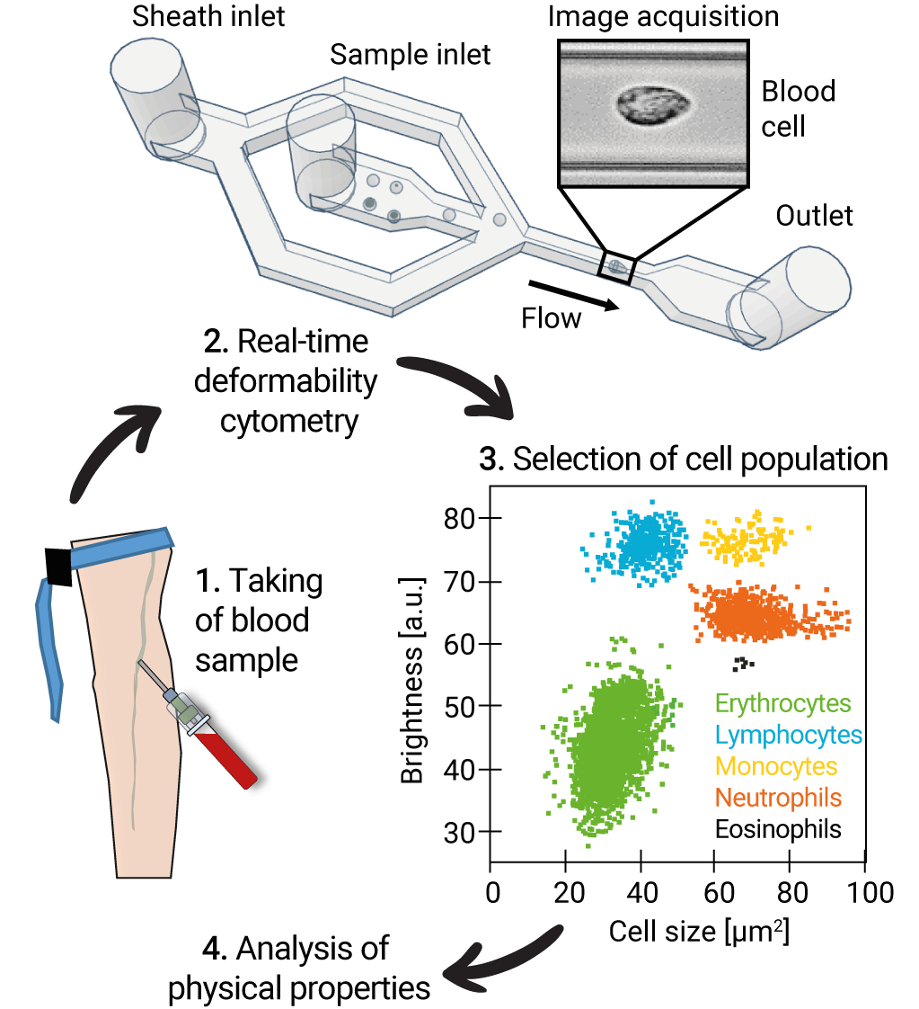 To analyse the blood cells, they used a self-developed method called real-time deformability cytometry (RT-DC), which has recently been recognized with the prestigious Medical Valley Award. In this method, the researchers send the blood cells through a narrow channel at high speed. In the process, the leukocytes and erythrocytes are stretched. A high-speed camera records each of them through a microscope, and custom software determines which cell types are present, and how big and deformed they are. Up to 1000 blood cells can be analysed per second. The advantage of the method: It is fast and the cells do not have to be labelled in a laborious procedure.