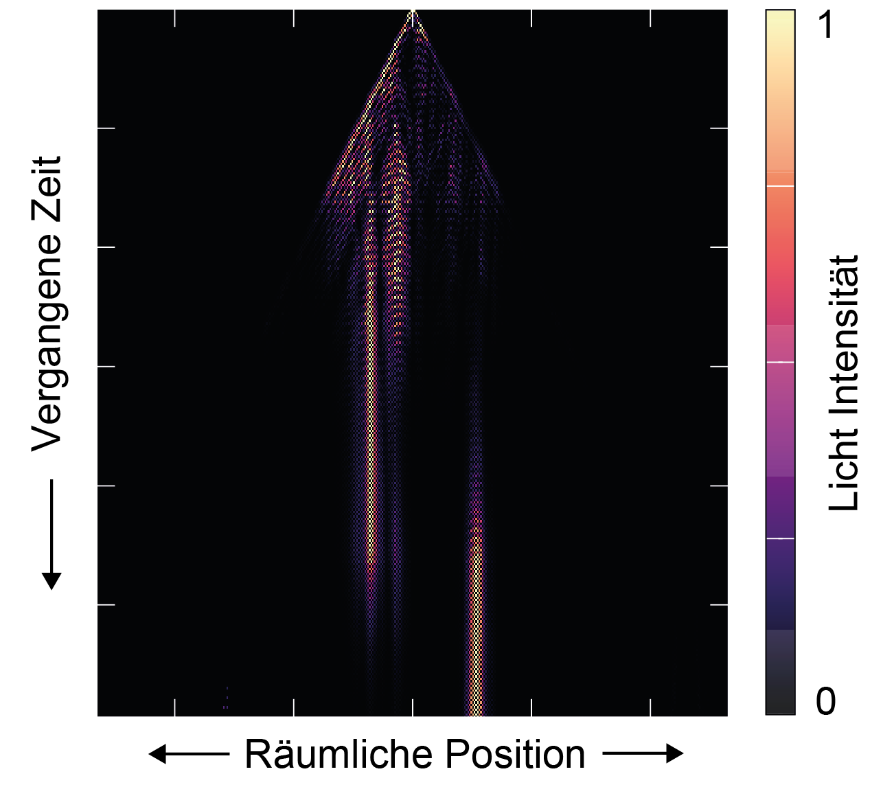 Die Darstellung zeigt die im Experiment gemessene Lichtausbreitung: Anfänglich breitet sich das Licht aus, bis es durch die Unordnung (hier nicht sichtbar) in einem engen Raumbereich gefangen wird. Nach kurzer Zeit, springt der hellste Spot plötzlich und völlig unerwartet zu einem anderen Raumbereich. Aus: S. Weidemann, M. Kremer et al. Nature Phot. 16 (2021). https://www.nature.com/articles/s41566-021-00823-w