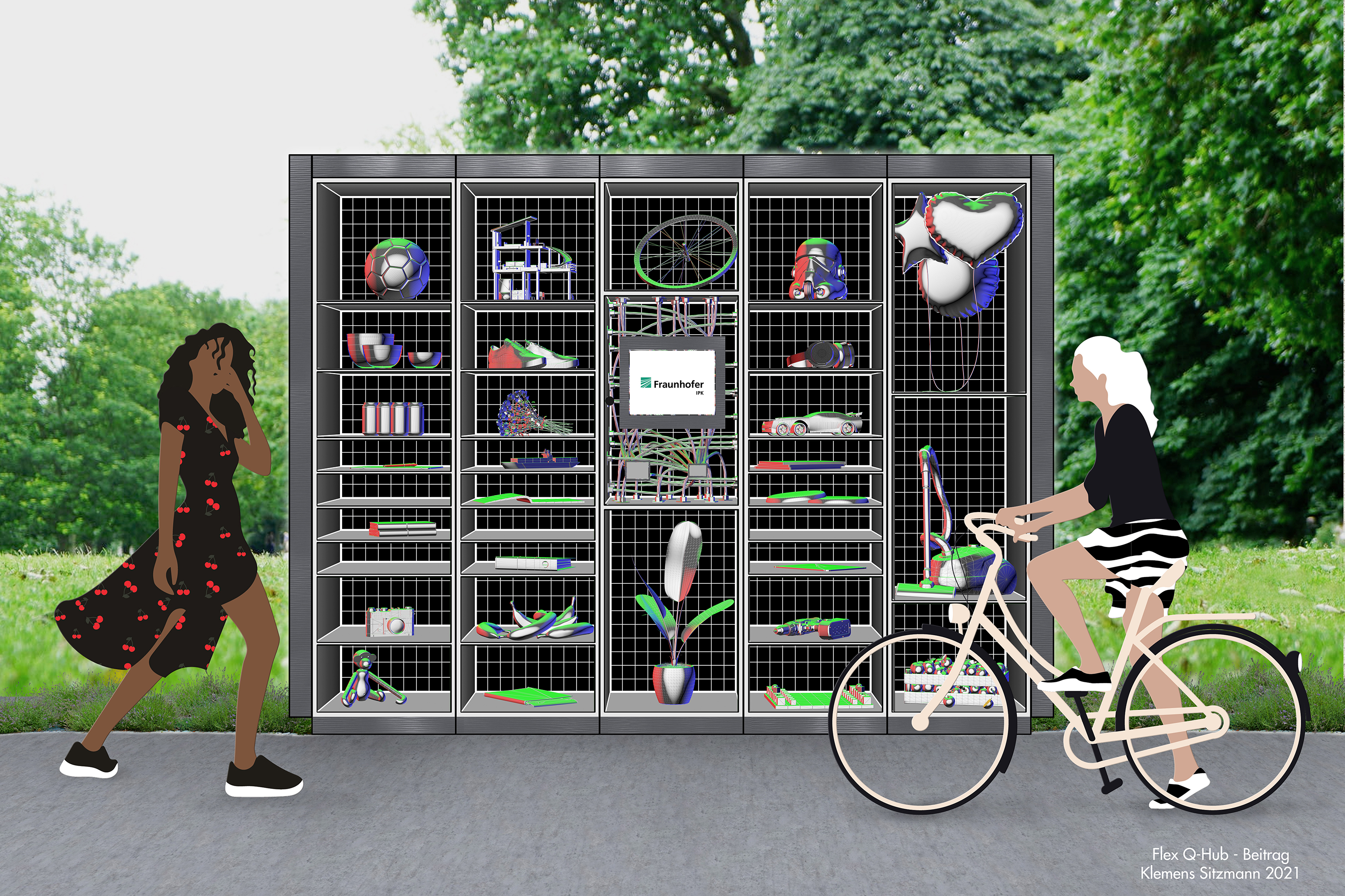Ein besonderer Hingucker wird der Flex Q-Hub mit Sicherheit, denn die einzelnen Fächer sind von außen in aufsehenerregender 3D-Optik gestaltet. Die Aufdrucke zeigen wie durch einen Röntgenblick, was sich hinter den Türen verbergen könnte: eine Zimmerpflanze vielleicht? Ein Fahrradschlauch? Neue Sneakers? Das Design ist das Ergebnis eines Gestaltungswettbewerbs, den der Architekt und Designer Klemens Sitzmann für sich entscheiden konnte. Zur Bedeutung des Designs im Rahmen des Projekts sagt Sitzmann: »Gute Ideen müssen an die Menschen gebracht werden, und gerade in Berlin ist ein sensibler Umgang und gelungene Kommunikation Schlüssel zur Akzeptanz neuer Projekte. Innovation muss Spaß machen, Fortschritt muss beleben.«