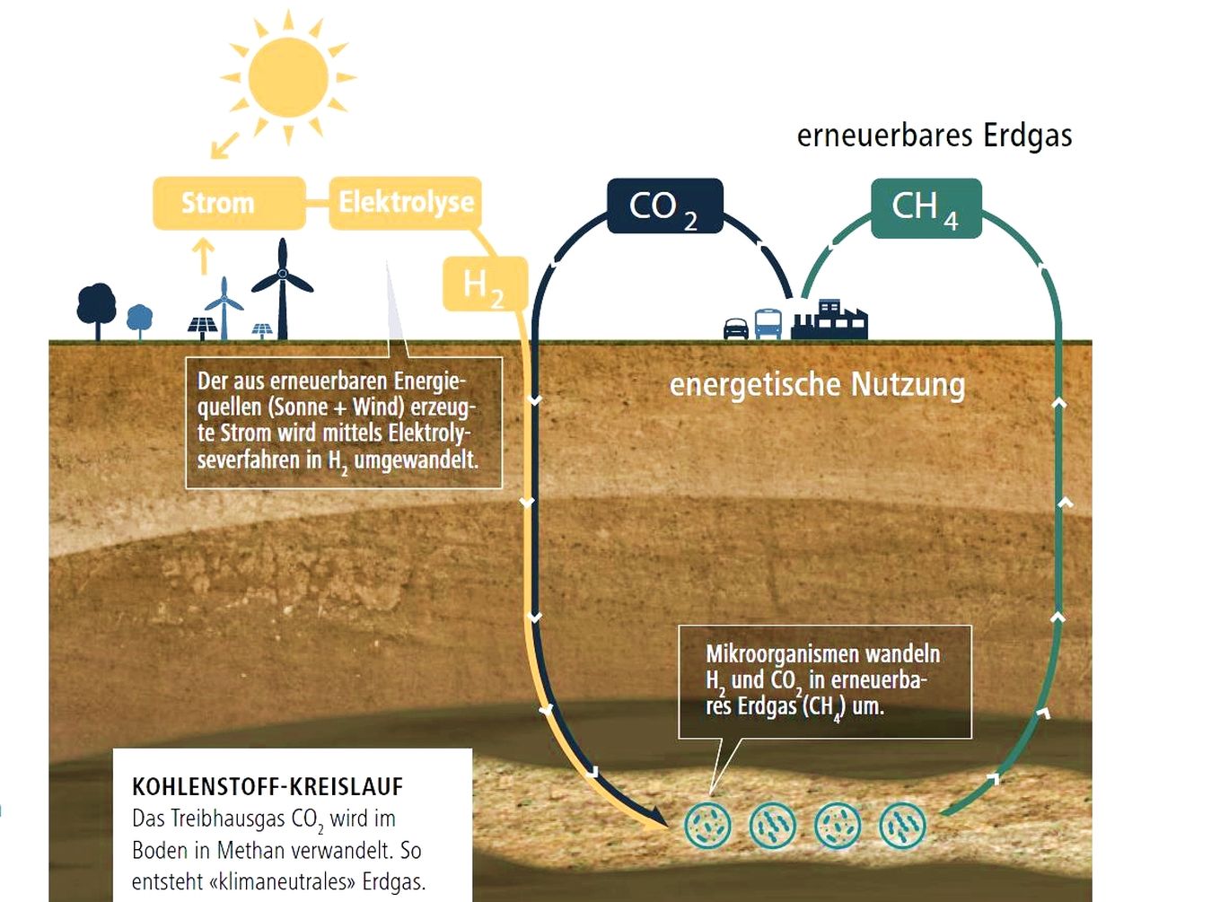 Dort kommen dann die kleinen Helferchen ins Spiel: Mikroorganismen aus der Urzeit, sogenannte Archaeen, wandeln über ihren Stoffwechsel Wasserstoff und CO2 zu erneuerbarem Methan (CH4) um. Archaeen sind auf der ganzen Welt verbreitet, vorwiegend in anaeroben, also sauerstoffarmen Umgebungen, und sie waren vor Millionen von Jahren bereits für die Umwandlung von Biomasse in Erdgas verantwortlich. Durch die Zuführung von Wasserstoff und CO2 in geeignete poröse Sandsteinlagerstätten wird dieser Prozess quasi von neuem gestartet. Das dort unten «hergestellte» Methan kann dann im Winter den Speichern wieder entzogen und als CO2-neutrales Erdgas vielfältig genutzt werden.
