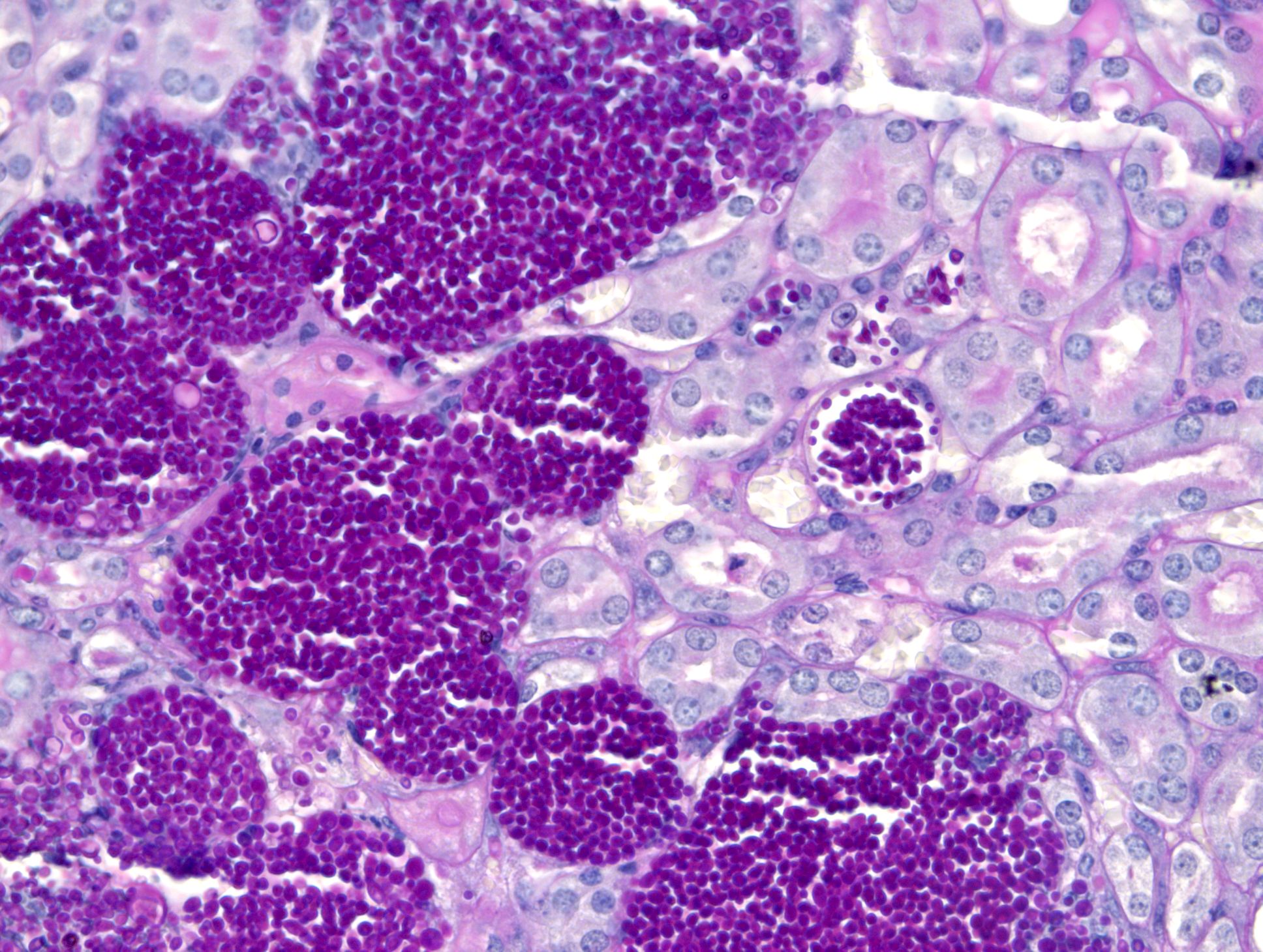 „Als wir uns das Gewebe der Tiere anschauten, fanden wir eine hundertfach höhere Pilzbelastung der Organe“, so Christine Dunker. Sie ist Doktorandin in Jacobsens Team und Erstautorin der Studie. „Der Pilz konnte sich in den Organen blitzschnell vermehren. Durch diese hohe Menge an Pilzzellen beispielsweise im Nierengewebe entstand ein enormer Druck, der die Organe schließlich erheblich schädigte.“ Auch die Reaktion des Immunsystems hat eine Auswirkung auf den schweren Krankheitsverlauf: „Die Makrophagen, also unsere Fresszellen, erkannten den Pilz zwar zu Beginn der Infektion. Jedoch schlug das Immunsystem erst in einem späteren Stadium Alarm und veranlasste die Bildung einer Vielzahl von weißen Blutkörperchen, sogenannte neutrophile Granulozyten“, ergänzt Dunker. „Beim Versuch die Eindringlinge abzutöten, lösten die Immunzellen starke Entzündungsreaktionen aus und schädigten das Gewebe zusätzlich. Dieser Kollateralschaden ist aufgrund der Pilzmenge größer als beim Wildtyp.“