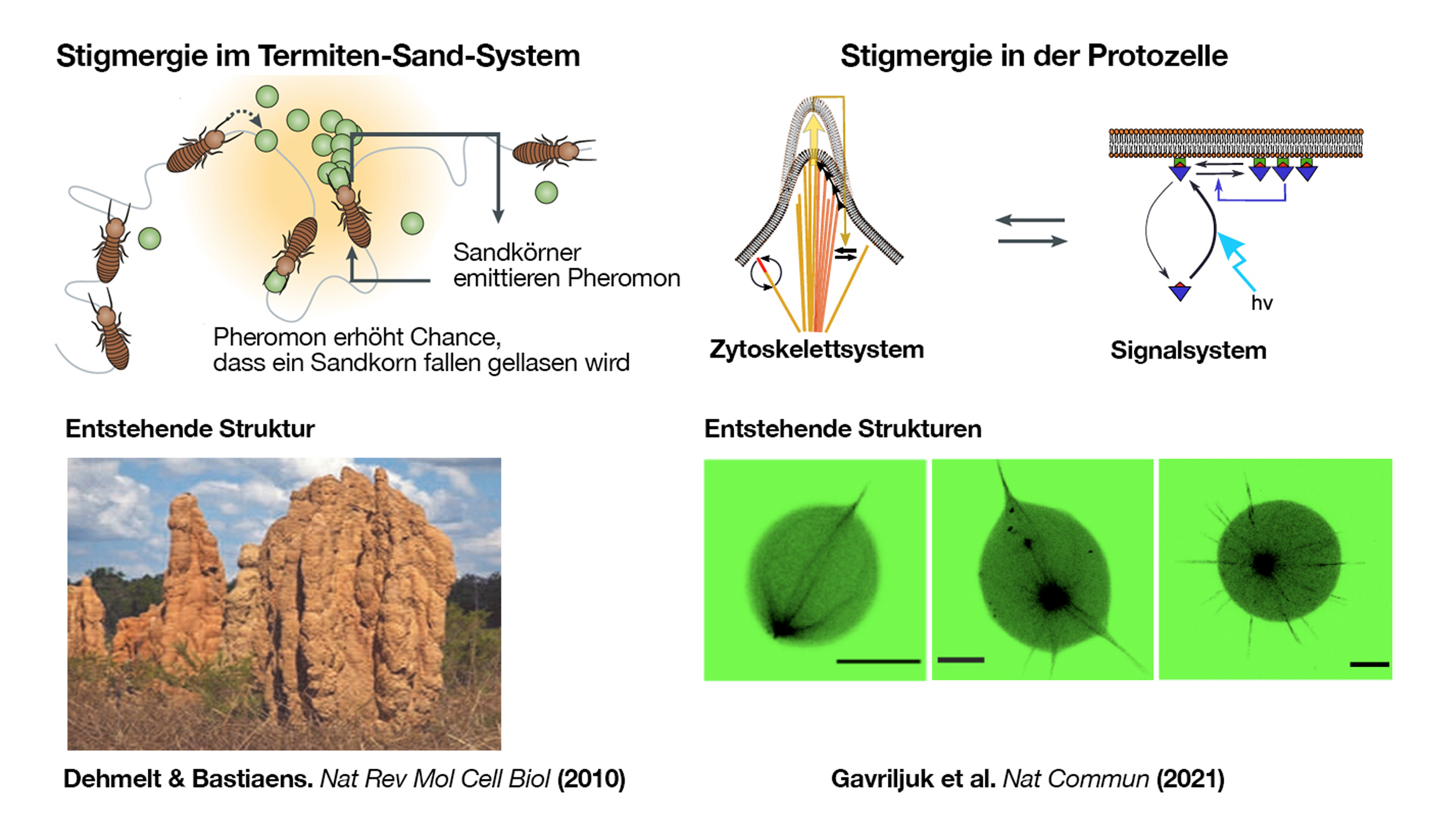 Mit den lebensähnlichen Protozellen konnten die Wissenschaftler ihre Theorie bestätigen, dass die Bildung der Zellform den Prinzipien des stigmergischen Termiten-Sand-Systems folgt. Sowohl das Zellskelett als auch das Signalsystem zeigen selbstorganisierende Eigenschaften, die durch Interaktionen mit der Plasmamembran zustande kommen. Bildet sich durch das lokale Wachstum des Zellskeletts eine kleine Ausstülpung der Membran, werden dadurch weitere Mikrotubuli eingefangen, was das Wachstum der Ausstülpung immer mehr verstärkt und freie Mikrotubuli verbraucht. Im Falle des Signalsystems führt die Rekrutierung der Kinase an die Membran zu sich selbstverstärkenden Aggregaten dieser, wodurch die freie Kinase verbraucht wird. Mehr noch, die Forschenden konnten zeigen, dass die indirekte Kommunikation zwischen dem Signal- und dem Zytoskelettsystem durch die verformbare Membran vermittelt wird und zu selbstorganisierten Formen wie sternförmigen oder polaren Strukturen führt. Sie konnten auch zeigen, dass lokalisierte extrazelluläre Signale ähnlich wie die Pheromon-emittierende Termitenkönigin wirken, indem sie eine chemische Vorlage bereitstellen, die das selbstorganisierende Termiten-Sand-System anweist, ein dynamisches Gebäude um sie herum zu strukturieren. Im Fall der Protozellen zwingt der Signalisierungsgradient die selbstorganisierenden Lösungen der beidseitig kommunizierenden Signal- und Zytoskelettsysteme dazu, die lebensähnlichen Zellen in Richtung der extrazellulären Signale zu reorganisieren. Allerdings war die Reaktion auf die extrazellulären Signale sehr stark von der anfänglichen, selbstorganisierten Form der Protozellen abhängig, die, wie die Wissenschaftler vermuteten, aus vorherigen Erfahrungen hervorgeht.
