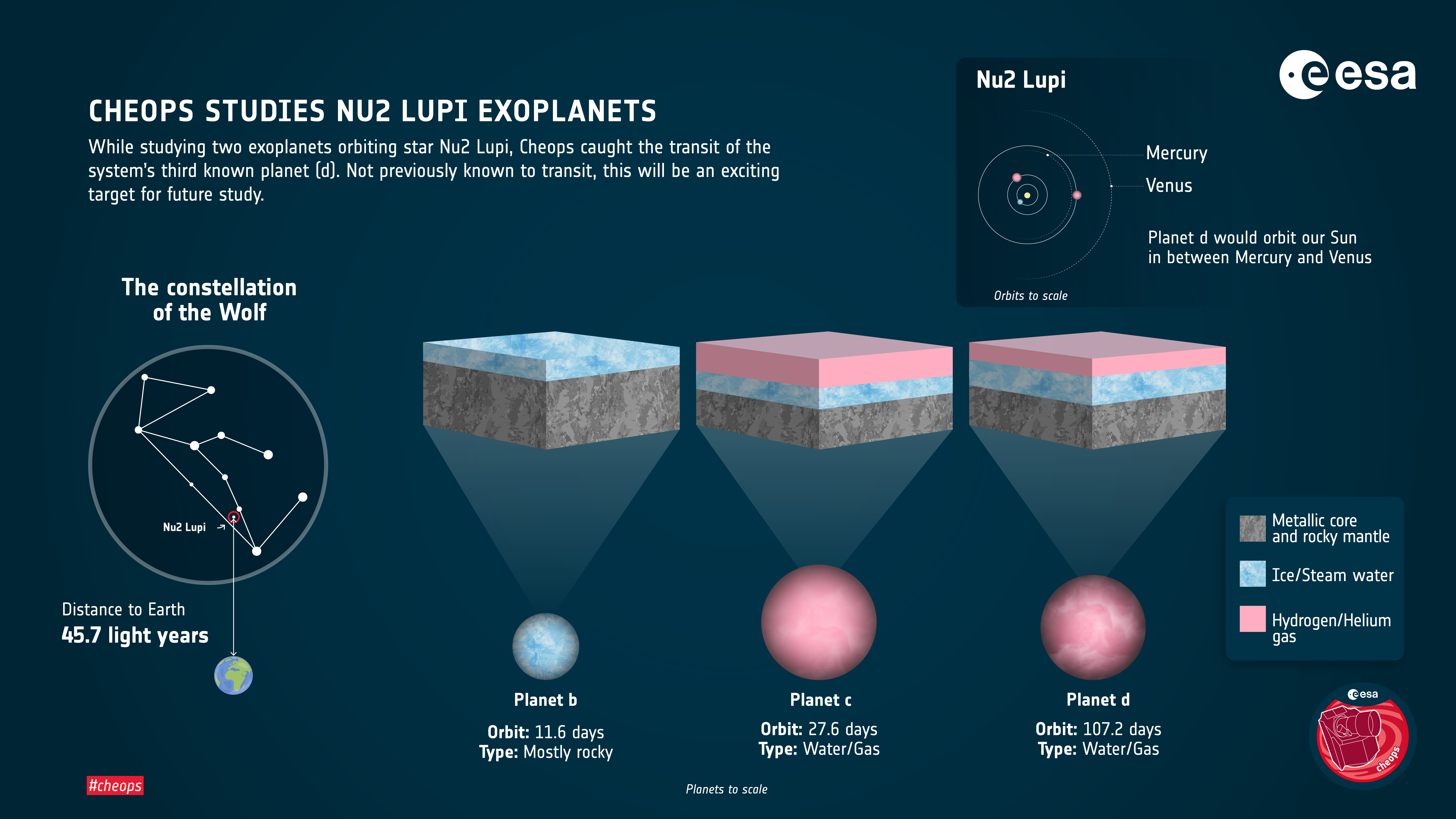 Das Planetensystem befindet sich im Sternbild Lupus (lateinisch für Wolf), um einen Stern namens Nu2 Lupi, der mit blossem Auge sichtbar ist (allerdings nicht von der Schweiz aus). Im Jahr 2019 gaben Schweizer Astronomen die Entdeckung von drei Exoplaneten um diesen hellen, sonnenähnlichen Stern bekannt. Die drei Exoplaneten haben Massen zwischen denen von Erde und Neptun (17-mal jene der Erde) und brauchen 12, 28 und 107 Tage, um ihren Mutterstern zu umkreisen. «Was diese Exoplaneten wirklich herausragend macht, ist, dass wir sie direkt vor ihrem Stern vorbeiziehen sehen können; man spricht von einem 'Transit'», sagt Yann Alibert, Professor für Astrophysik an der Universität Bern und Mitautor der Studie, die soeben in der Fachzeitschrift Nature Astronomy publiziert wurde. «Das wussten wir bereits über die beiden inneren Planeten, was uns dazu veranlasste, CHEOPS überhaupt auf das System zu richten. Der dritte Planet ist jedoch ziemlich weit vom Stern entfernt, seinen Transit hatte niemand erwartet», ergänzt Alibert. Je weiter der Planet von seinem Stern entfernt ist, desto unwahrscheinlicher ist nämlich ein Transit.