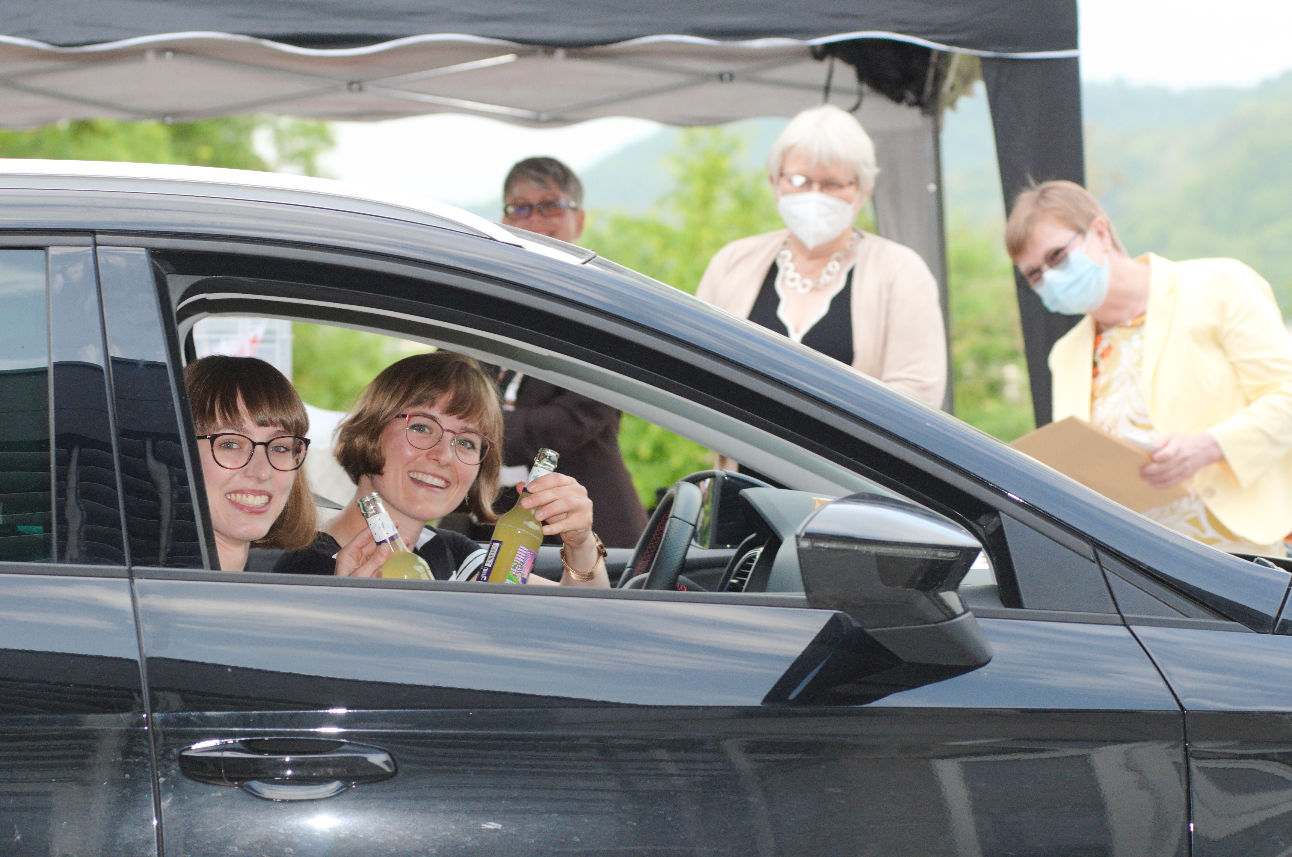 Eine Stunde später geht es offiziell los: Die Absolventinnen und Absolventen fahren im Autokorso hinauf zur Hochschule. „Let it roll“, ruft Hochschulpräsidentin Prof. Dr. Christiane Fritze aus den Lautsprechern. Es ist die erste Abschlussfeier, die live im Radio übertragen wird. Am Drive-in Schalter auf dem Parkplatz gratulieren Lehrende und weitere Mitarbeitende den Studierenden ihrer Fakultät, reichen Snacks und Getränke in die Autos. Aus allen Fenstern schallt die gleiche Musik. Radio EINS spielt drei Stunden lang nur Songs, die sich die Studierenden gewünscht hatten. Tessa Wolter hat sich „Wenn ich groß bin“ der Berliner Band SDP ausgesucht, Felix Pfaff den Klassiker „The Longest Time“ von Billy Joel und Johanna Fritsche die Single „It‘s time“ der US-Rocker Imagine Dragons. Radio-EINS-Moderatorin Uli Noll ist begeistert von der musikalischen Vielfalt und der Freude der Studierenden. Viele können die Füße nicht stillhalten. Sitztanz im Auto.
