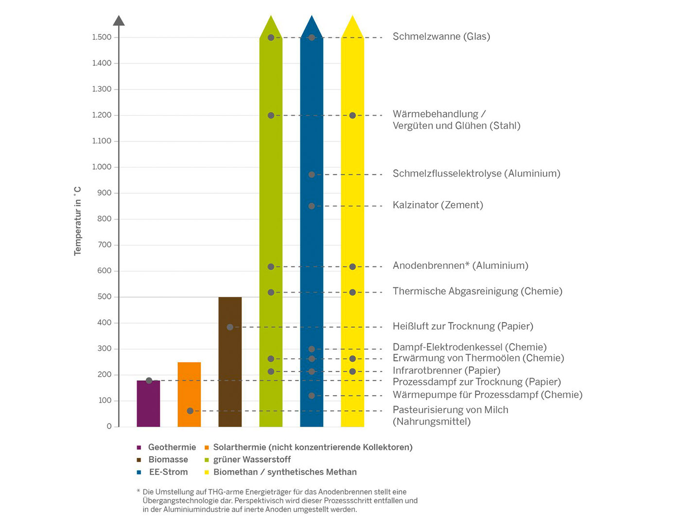 • Stufe 2: Erschließung rege¬nerativer Wärmequellen wie Solar- oder Geothermie, wo es Standort und Temperaturniveau ermöglichen