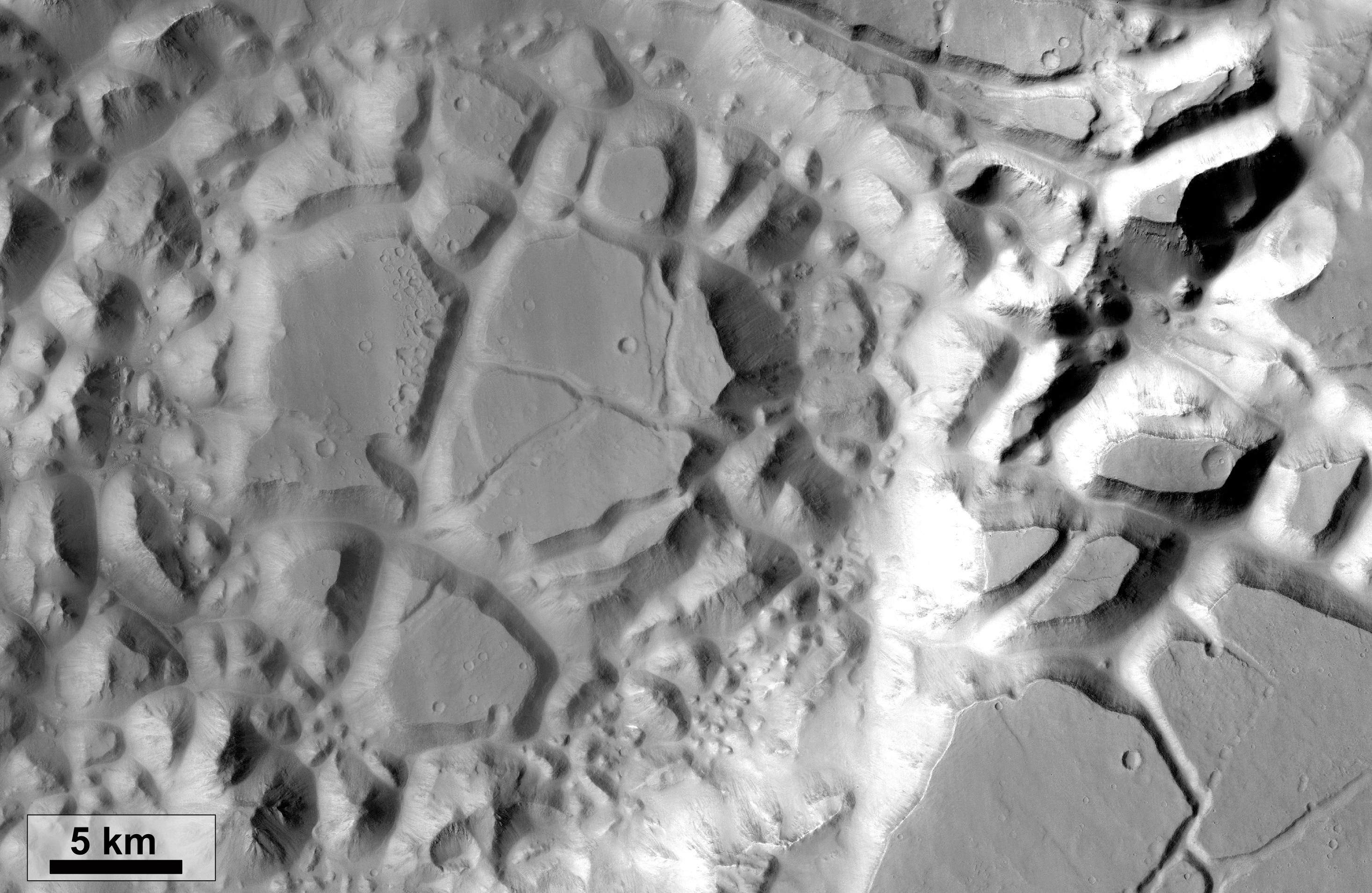 On Mars, chaotic terrains occur in different regions. They reach diameters of 20 to over 700 kilometers, consist in many cases of polygonal blocks, which can be several hundred meters high and have a very characteristic geometry. According to the most common thesis, the area was formed 3.7 to 2.9 billion years ago, when ice reservoirs under the surface suddenly melted due to heat and released large amounts of water. After the water drained away, the surface collapsed over the newly formed cavities, and the landscape crumbled in on itself.