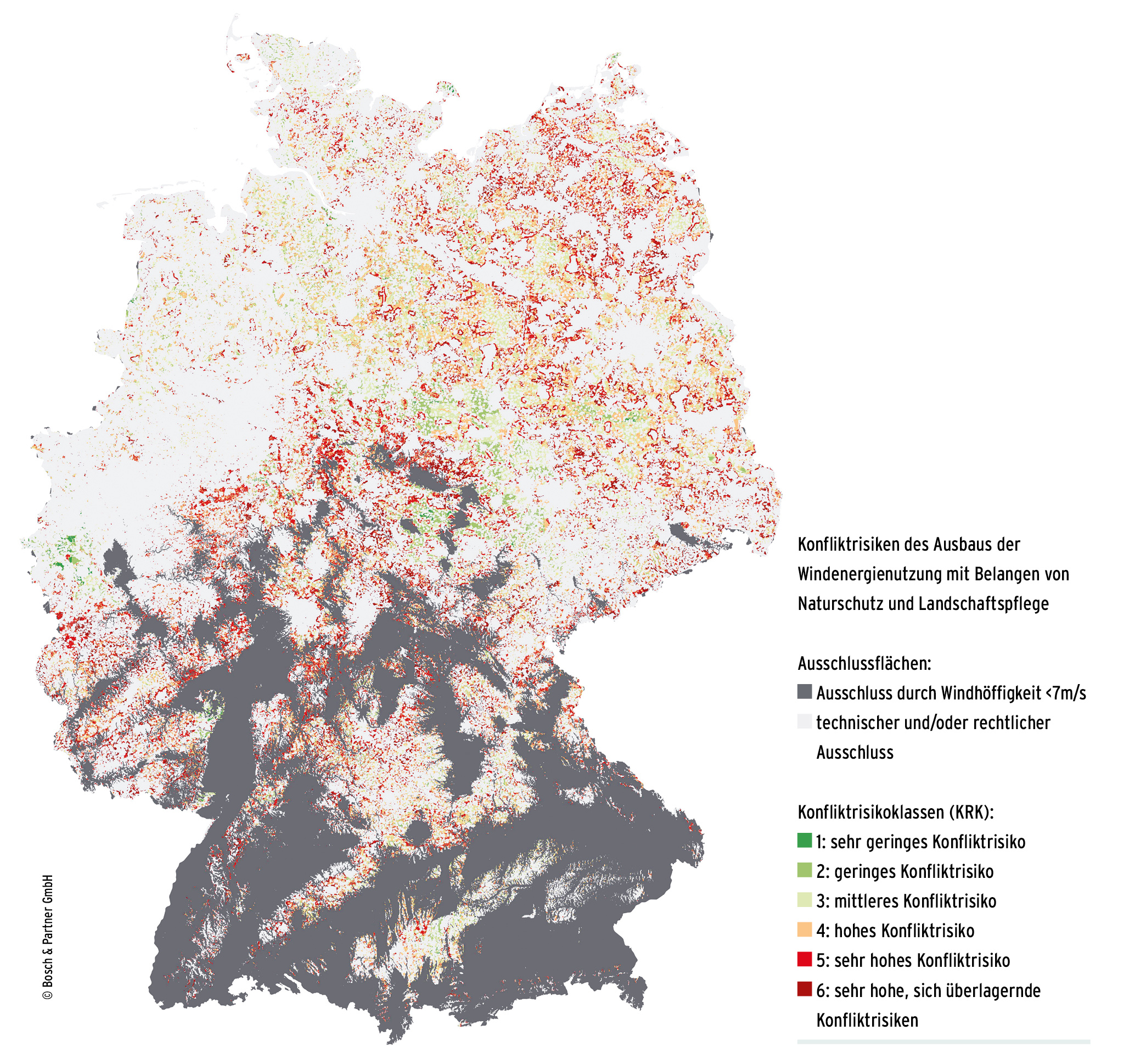 Schon jetzt werden seitens der Politik bestimmte Flächen für den Bau von Windkraftanlagen ausgeschlossen, weil beispielsweise ein Flughafen, Stromleitungen oder Wohngebiete in der Nähe liegen. „Aber Umwelt- und Landschaftsschutz werden in den frühen Planungsphasen nicht ausreichend in der Planung berücksichtigt, die kommen dann oft erst vor Gericht zum Tragen und genau das kostet Zeit“, erklärt Dr. Wolfgang Peters von Bosch & Partner. „Eine konsistente Herleitung der Notwendigkeit einer Windenergieanlage von den bundesweiten Ausbauzielen bis zum konkreten Anlagenstandort dagegen ist ein wichtiger Faktor für Akzeptanz.“ Die Wissenschaftler haben deshalb bereits bei ihrer strategischen Flächenplanung Umweltaspekte einbezogen: Liegt ein Vogelschutzgebiet oder ein Biosphärenreservat in der Nähe? Gibt es Feuchtgebiete oder einen angrenzenden Wald, dessen Tierwelt gefährdet ist? Das Ergebnis ist eine Flächenkarte mit unterschiedlichen Risikoklassen. Auf rund 3,6 Prozent der Fläche in Deutschland schätzen die Wissenschaftler das Konfliktpotential mit Natur- und Landschaftsschutz als so gering ein, dass die Chancen für den Bau einer Windkraftanlage gut bis sehr gut sind. Das sind insgesamt knapp 13.000 Quadratkilometer.