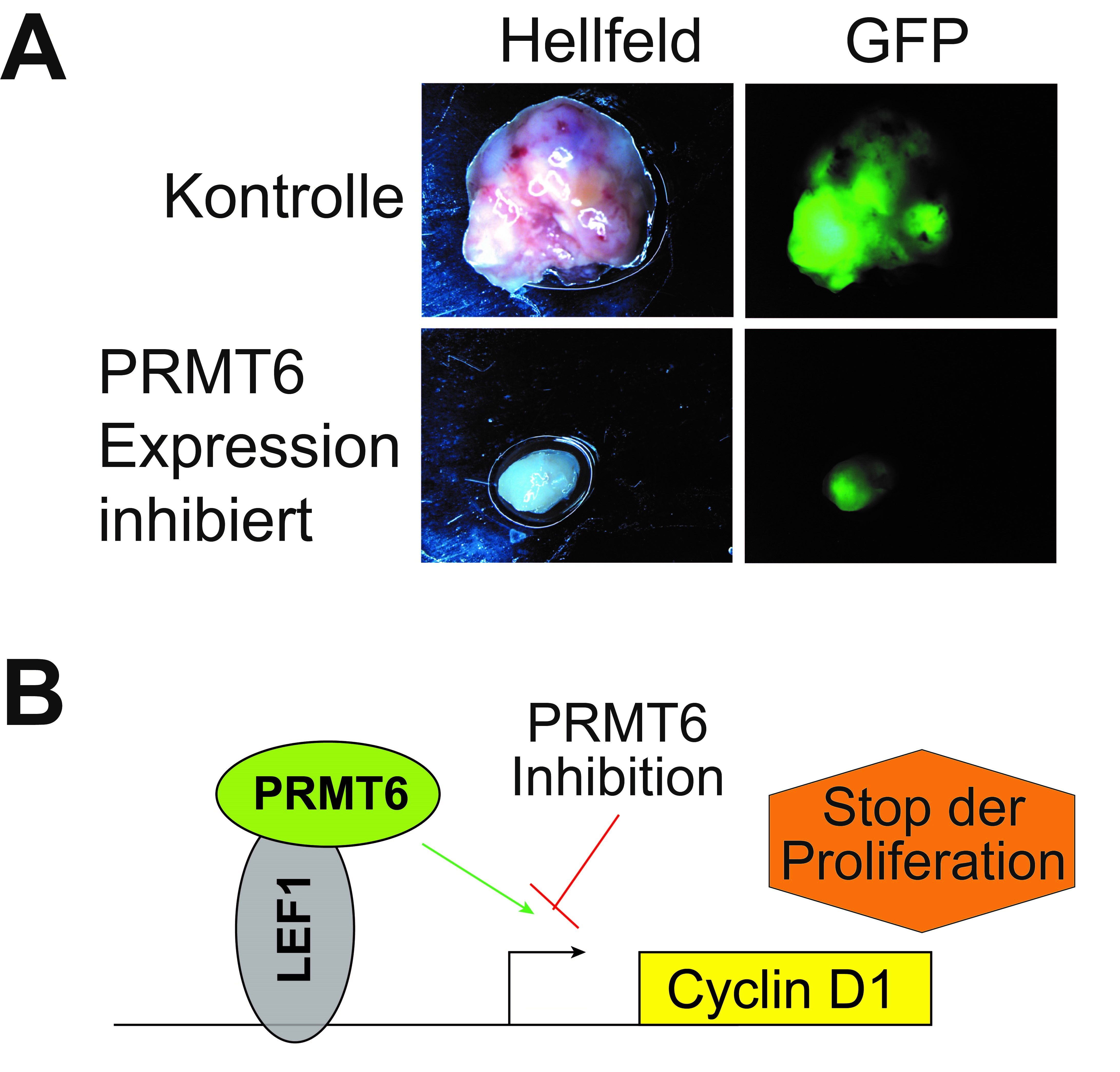 A. In einem Tumormodel verringert die Inhibition der Protein-Arginin-Methyltransferase 6 (PRMT6) durch shRNA (small hairpin RNA) das Tumorwachstum im Vergleich zur Kontrolle. Gezeigt sind die Tumoren in der Hellfeld-Mikroskopie und in der Fluoreszenz-Aufnahme (green fluorescent protein, GFP).