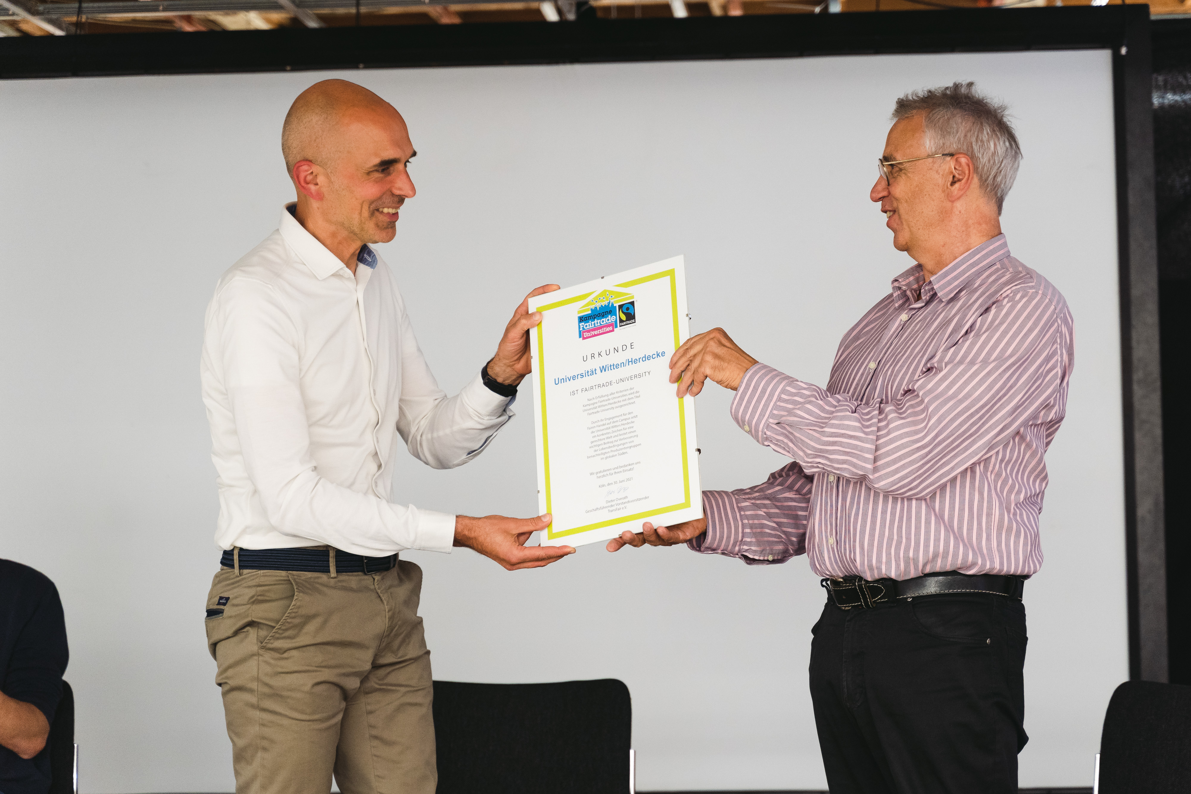 Am 30. Juni nahm der Vize-Präsidenten der UW/H, Dirk Jakobs, die offizielle Urkunde im Wittener Unikat entgegen: "Als Universität übernehmen wir gesellschaftliche Verantwortung und haben deshalb einen engagierten Nachhaltigkeitsprozess angestoßen. Diese Auszeichnung zeigt, dass wir dies auch global denken und neben ökologischen Themen auch die sozialen Aspekte in den Blick nehmen."