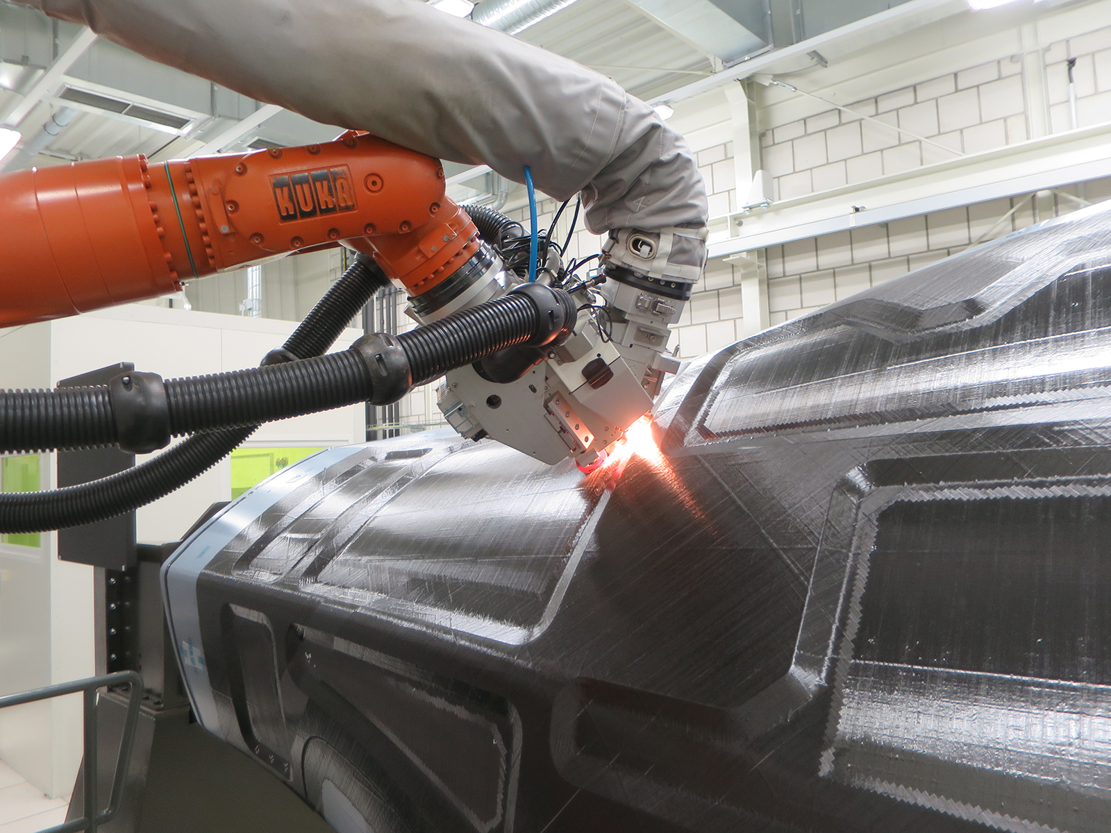 “Before the material is cured, the robot places the high quality fibers in a tool. It does this by following a specially developed programming methodology. The tool concept was developed specifically for the process chain. Its surface defines the shape of the