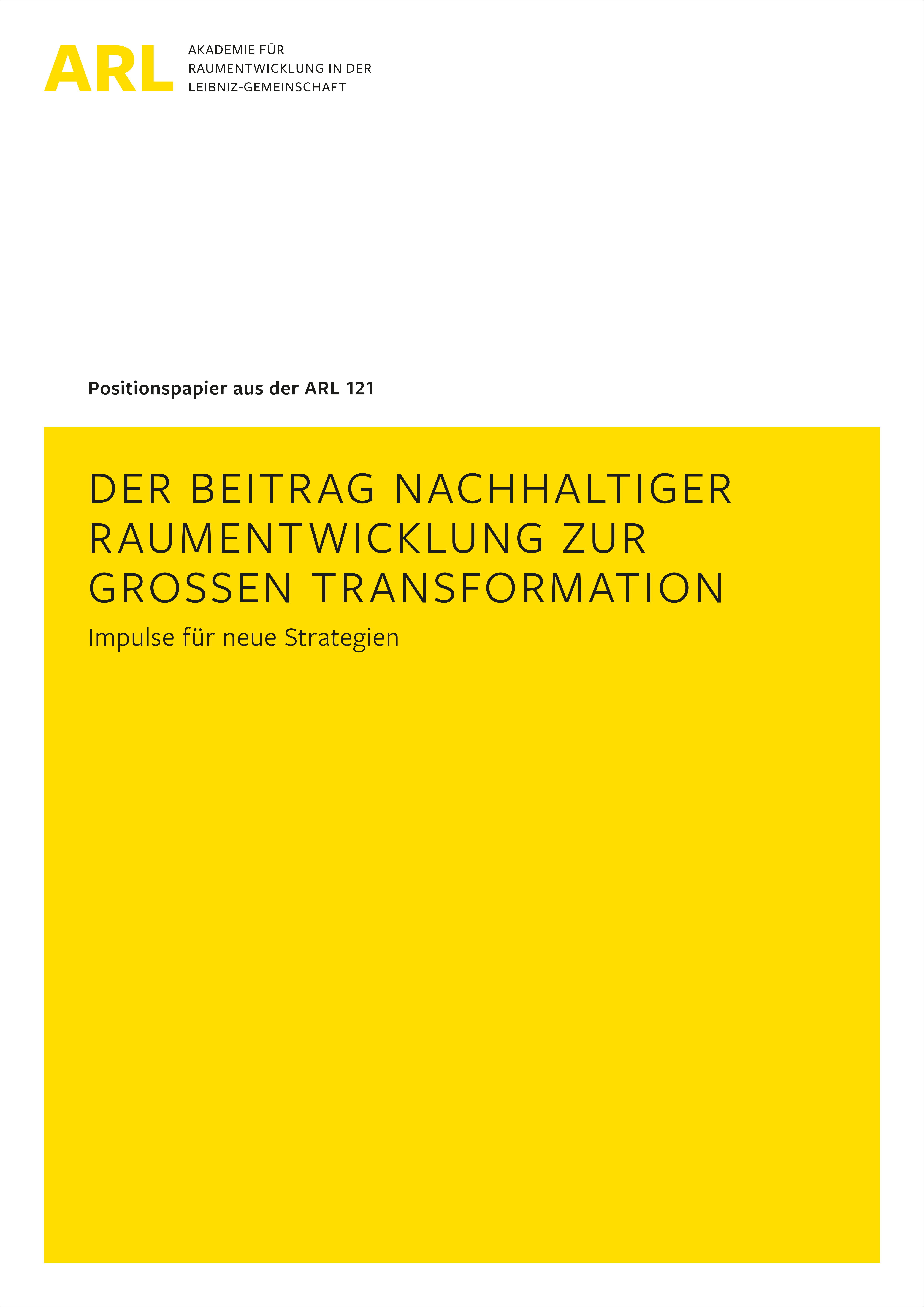 ARL – Akademie für Raumentwicklung in der Leibniz-Gemeinschaft (Hrsg.) (2021):Der Beitrag nachhaltiger Raumentwicklung zur großen Transformation – Impulse für neue Strategien.Hannover. = Positionspapier aus der ARL 121.URN: https://nbn-resolving.org/urn:nbn:de:0156-01211
