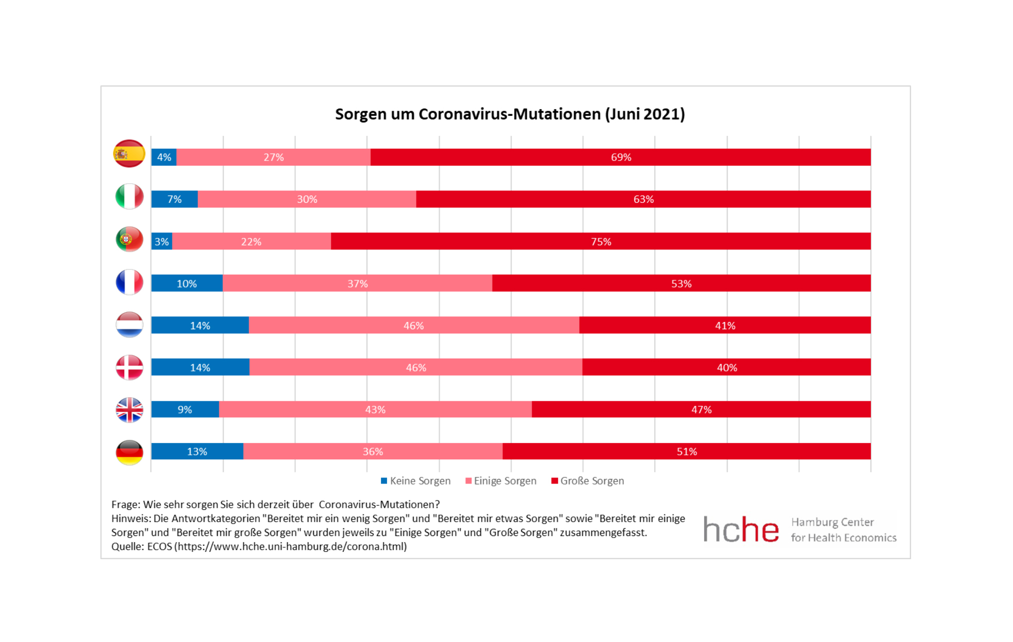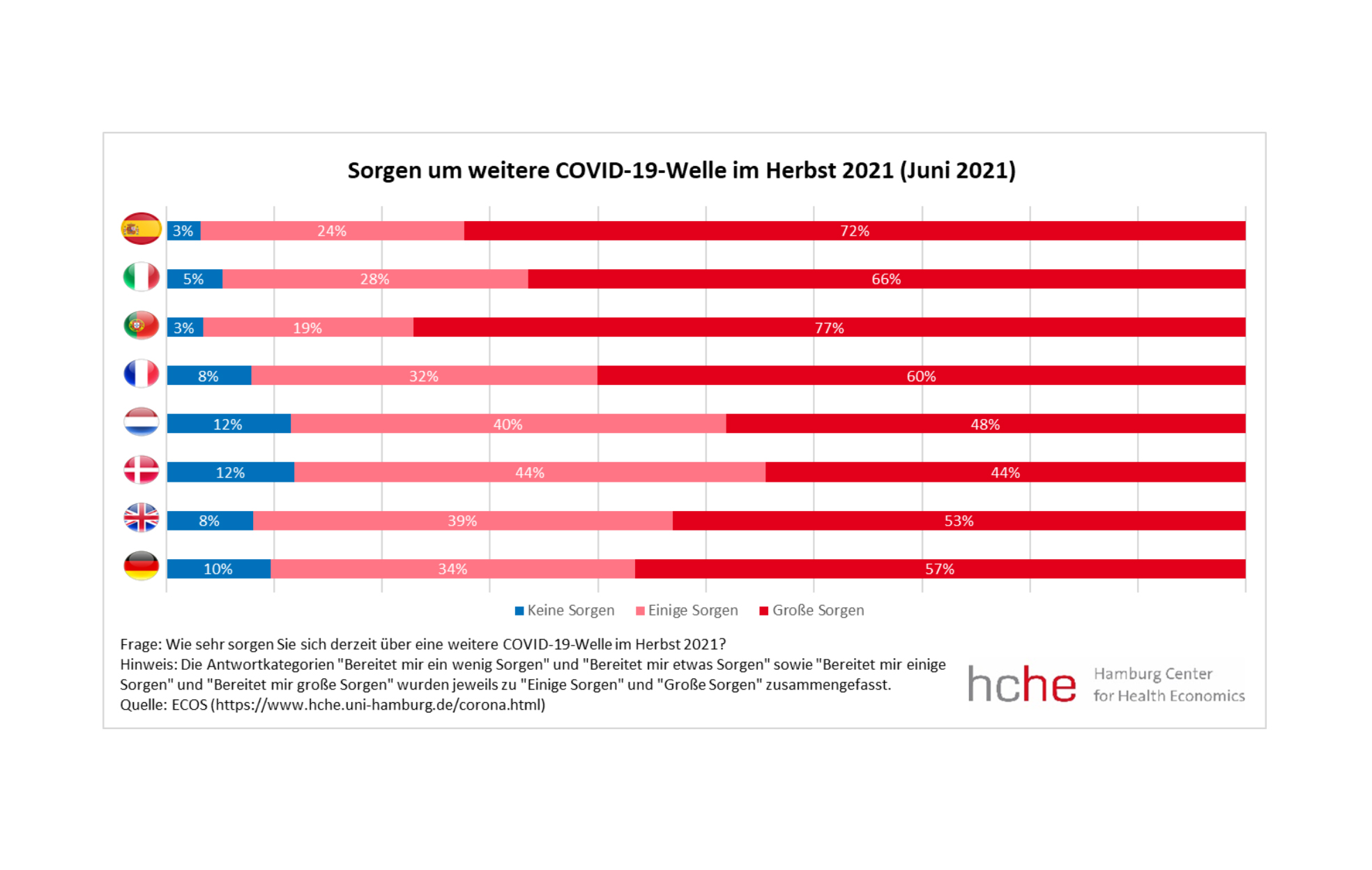 Obwohl die Impfungen zunehmen und die Inzidenzzahlen sinken, machen sich viele Menschen Sorgen wegen der weiteren Entwicklung der Pandemie. „Innerhalb Europas sehen wir ein Nord-Süd-Gefälle“, erklärt Jonas Schreyögg. Insbesondere in Spanien und Portugal ist die Angst vor weiteren Virus-Mutationen groß: 96 beziehungsweise 97 Prozent der Befragten sind beunruhigt. 75 Prozent der portugiesischen Bevölkerung machen sich sogar große oder sehr große Sorgen. In Deutschland liegen diese Werte mit 87 und 51 Prozent deutlich darunter; rund neun von zehn Befragten sind hier beunruhigt. Ein ganz ähnliches Bild ergibt sich bei der Frage nach einer möglichen vierten Welle im Herbst. Nur zehn Prozent machen sich in Deutschland darüber keine Gedanken, 57 Prozent haben dagegen große bis sehr große Sorgen. „Auch hier zeigt sich, dass die Sorgen der Bevölkerung von Dänemark zu den Mittelmeer-Ländern zunehmen“, so Schreyögg.