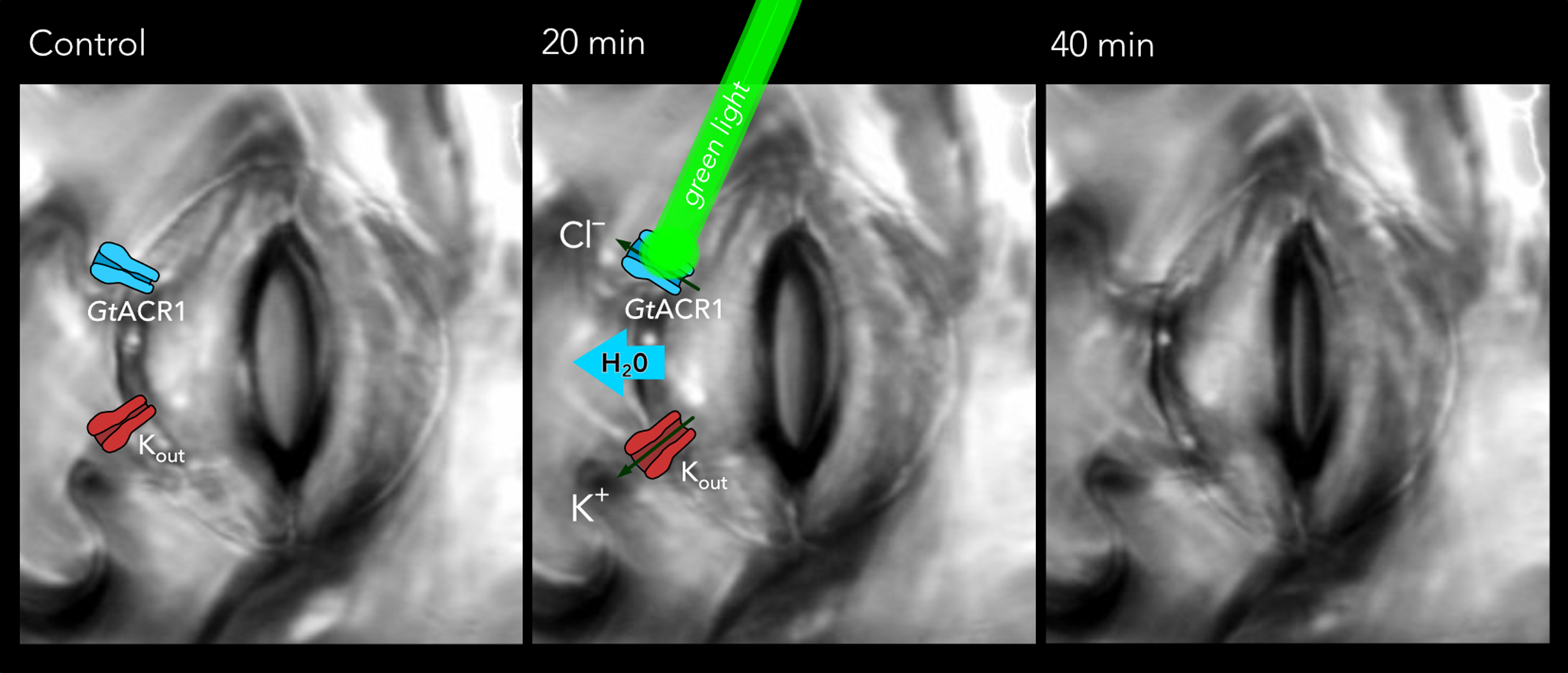 Als Lichtschalter verwendete die Gruppe ein lichtempfindliches Protein aus der Alge Guillardia theta, und zwar den Anionenkanal ACR1 aus der Gruppe der Channelrhodopsine. Auf Lichtimpulse hin sorgt der Schalter dafür, dass Chlorid aus den Schließzellen hinausströmt und Kalium nachfolgt. Die Schließzellen verlieren an Innendruck, erschlaffen und die Pore geht innerhalb von 15 Minuten zu. „Der Lichtpuls ist wie eine Fernbedienung für die Bewegung der Stomata”, sagt Hedrich.