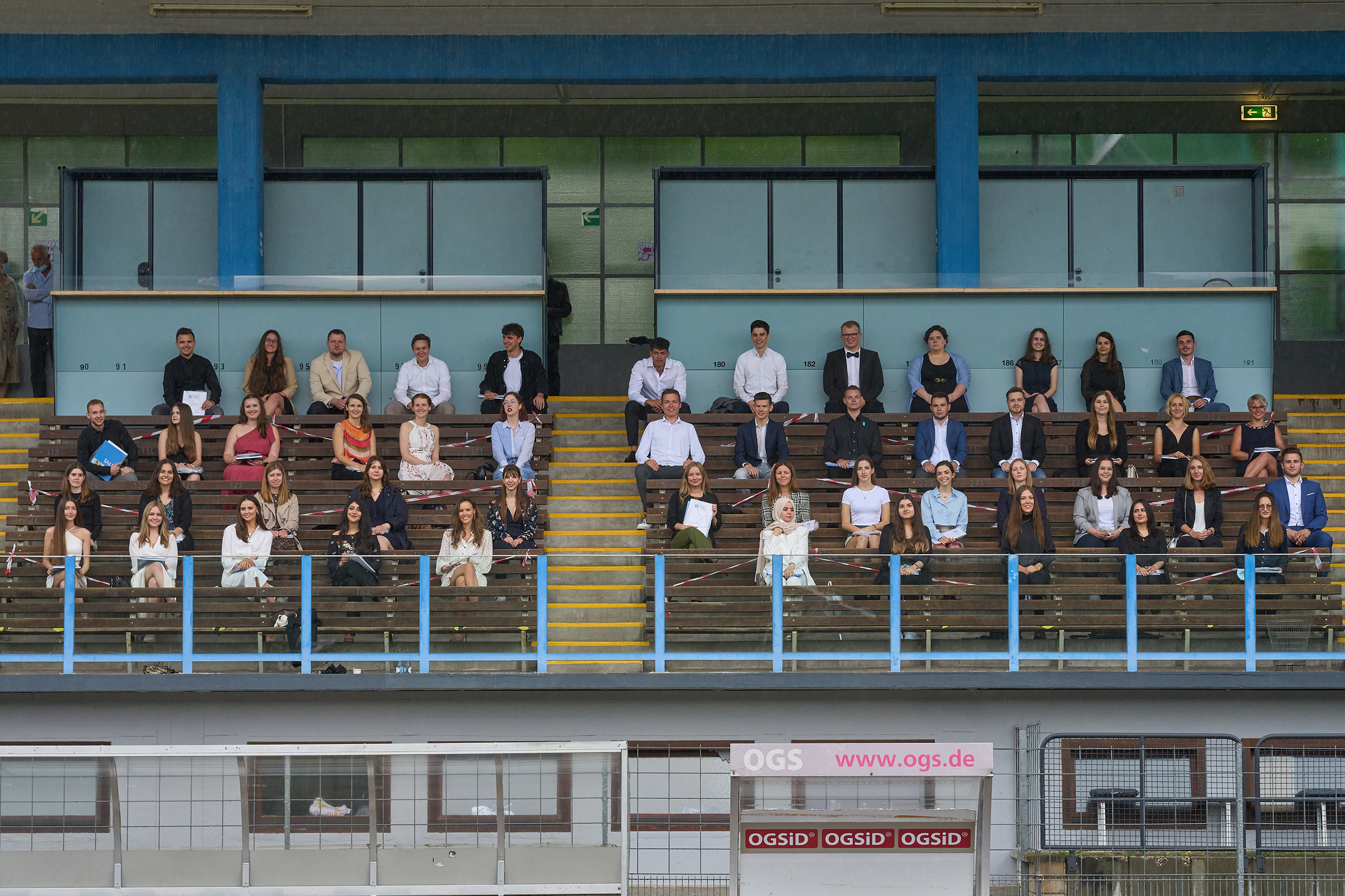Über das Hygienekonzept und die Vorgaben auf dem Stadiongelände waren alle Gäste zuvor per E-Mail informiert worden. Beim Eingang registrierten sich die Gäste in der Luca-App. Durch ein Wegeleitsystem gelangten die Familien vom Eingang zur Haupttribüne. Dabei achteten die studentischen „Linienrichter“ auf die Einhaltung der Abstandregeln. Die regenschützende Haupttribüne bietet in regulären Zeiten fast 700 Sportbegeisterten einen Sitzplatz. Zur Abstandswahrung wurde hierfür weit über die Hälfte der Sitzbänke gesperrt. Die Gäste durften nur an ihren Sitzplätzen ihre Masken abnehmen.