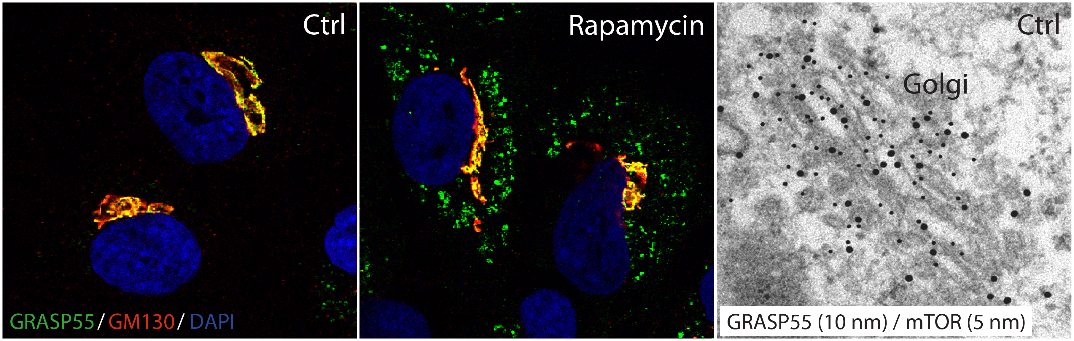 In their experiments, the Cologne scientists showed that various cellular stress factors, such as nutrient starvation, inactivate the protein complex mTORC1 and switch on the UPS transport pathway. "Under normal conditions, mTORC1 is active and adds a small chemical modification, called phosphorylation, to specific proteins, thus altering their activity or localization within the cell", explains research group leader Dr Constantinos Demetriades. In the case of the Cologne study, mTORC1 was shown to control the localization and function of a protein called GRASP55, which is normally located at the Golgi apparatus, the cell's protein cargo sorting center. "Under stress conditions, when mTORC1 is inactivated, GRASP55 is no longer retained at the Golgi and relocalizes to other compartments to promote UPS."