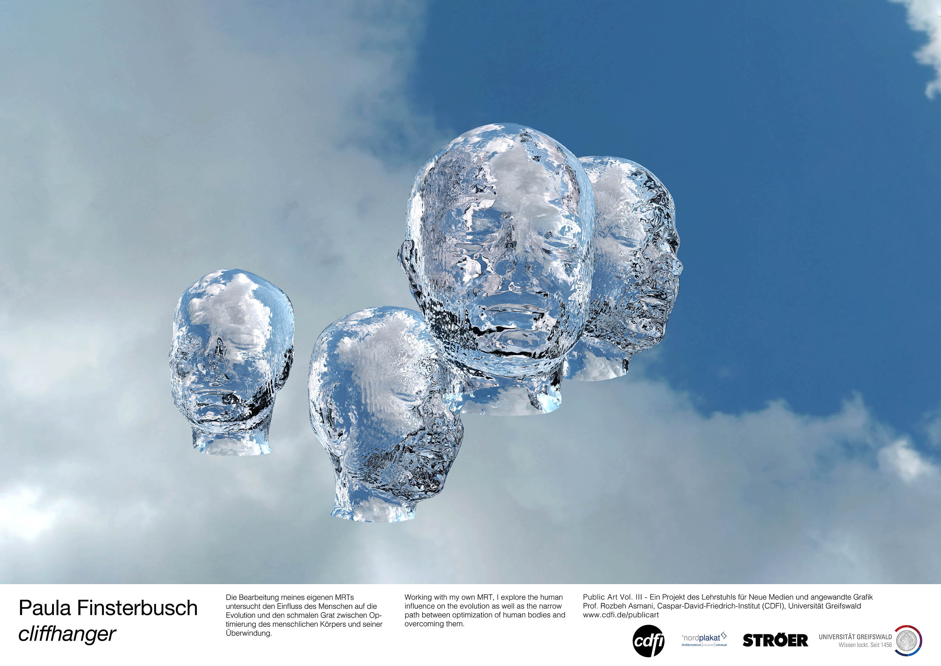 Für zehn Tage sind auf Plakatflächen und Litfaßsäulen in Greifswald künstlerische Arbeiten zu sehen. Diese wurden im Rahmen des Seminars „Public Art. Vol III.“ unter der Leitung von Prof. Dr. Rozbeh Asmani entwickelt. Im Rahmen seiner künstlerischen Arbeit gestaltete er Litfaßsäulen in Köln und Düsseldorf. Die Studierenden hatten bereits zweimal die Möglichkeit, analog ihre Werke an Flächen in Greifswald und Düsseldorf zu zeigen. Bei der nunmehr dritten Intervention kommen auch Bewegtbilder hinzu. Die Studierenden gestalten in diesem Sommer in Greifswald Werbeflächen im öffentlichen Raum in Kooperation mit dem Medienhaus Ströer, Werbe-Licht Dr. Jahn GmbH und der Großformatdruckerei Nordplakat. Zeitgenössische Kunst wird damit ein Teil der Stadtkultur.
