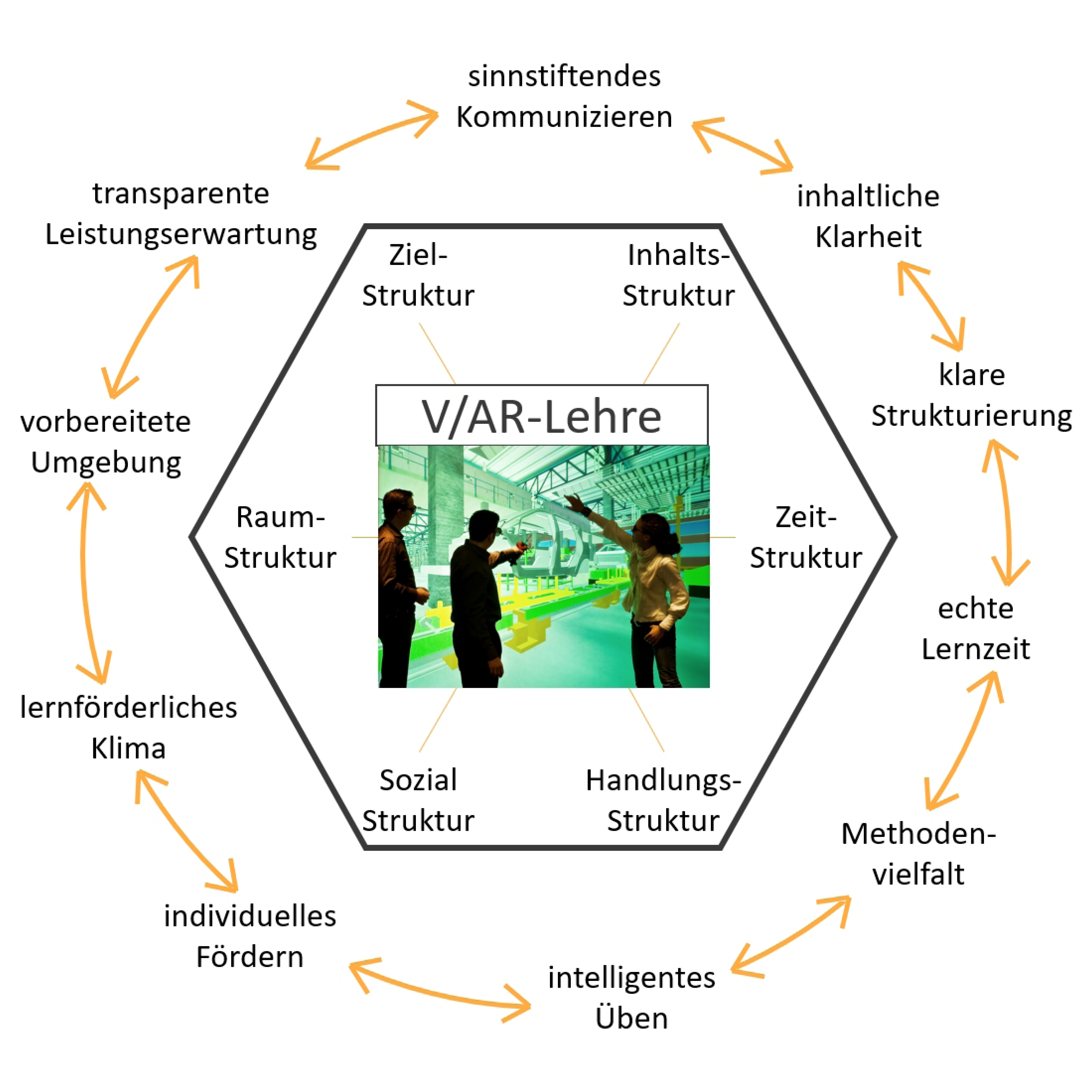 Zunächst wurde die grundlegende Didaktik-Lehre nach Methoden zum Aufbau von Lehrmodulen analysiert. Dabei interessierte insbesondere das Verständnis der Lehr-Lern-Prozesse, die Lernzieltaxonomie, fundamentale Unterrichtskonzepte sowie weitergehende Anforderungen an eine gelungene Lehre. Sodann folgt eine Bestandsaufnahme der heutigen V/AR-Lehre in Bezug auf Lernziele, Lernformen und den Lehrmitteleinsatz. Den Schluss bildet die Übertragung der Lernzieltaxonomie auf die V/AR-Lernziele sowie eine Zuordnung geeigneter Unterrichtskonzepte auf einzelne V/AR-Kursthemen und V/AR-Wissensbausteine (Beispiel: Welche V/AR-Kursinhalte lassen sich am besten mit Erfahrungsbezogenem Unterricht vermitteln, bei welchen V/AR-Inhalten sind andere Unterrichtskonzepte besser?).