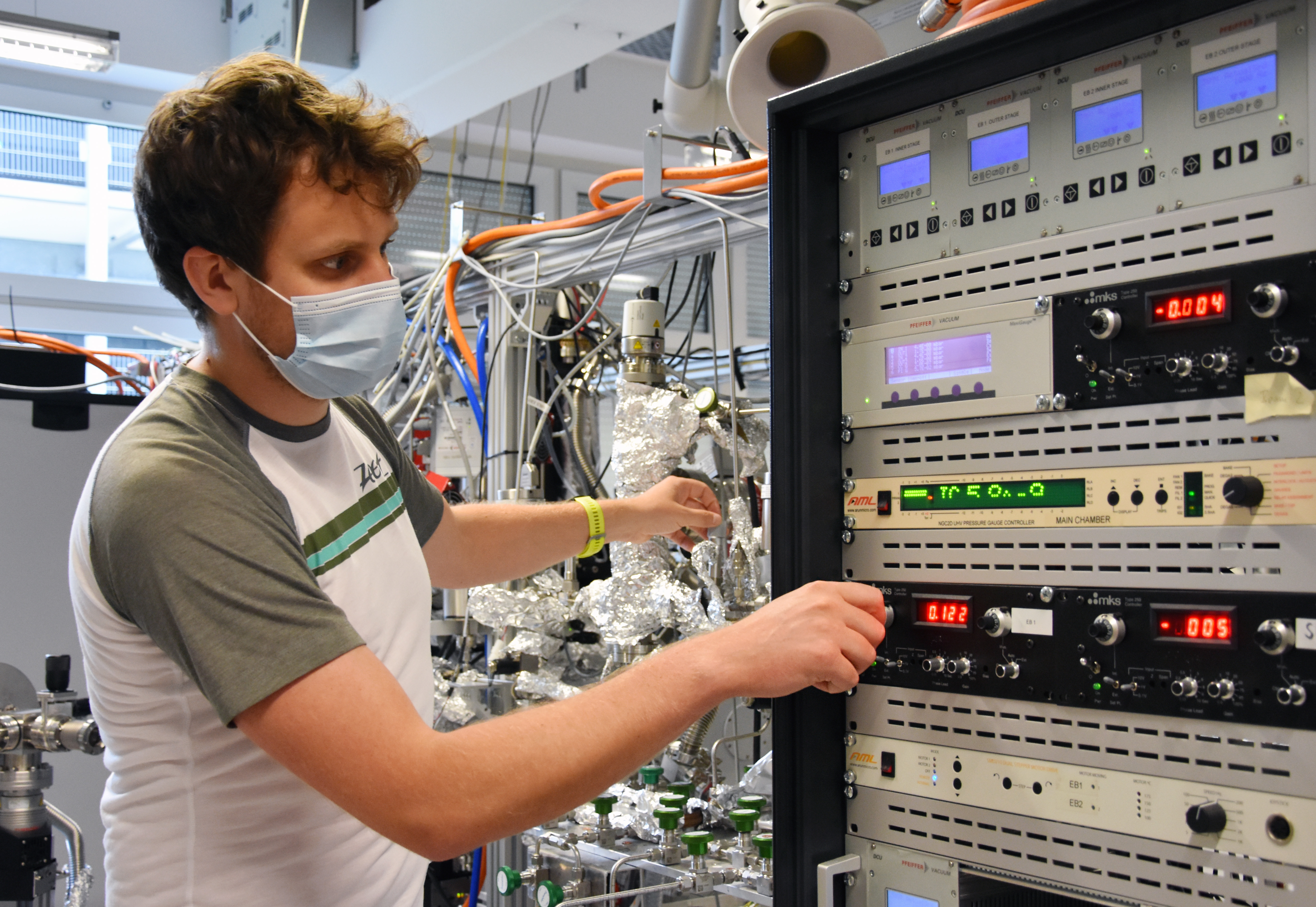 Bildunterschrift: An der Infrarotspektroskopieanlage stellt Doktorand Carsten Schröder den Druck der Acrolein-Moleküle ein, um die chemische Reaktion zu starten. © Julia Siekmann, Uni Kiel