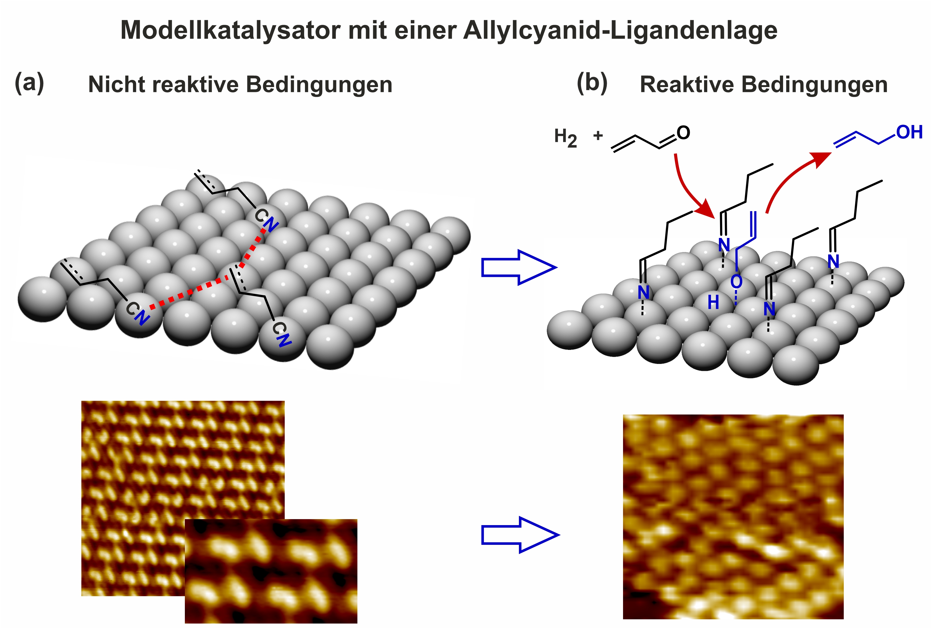 Bildunterschrift: Unter dem Rastertunnelmikroskop können die Chemikerinnen und Chemiker sehen, wie sich die Moleküle auf der Oberfläche ihres Katalysatormetalls im nicht-reaktiven Zustand (a) und unter reaktiven Bedingungen (b) unterscheiden. Das Modell zeigt, wie sich die chemische Zusammensetzung der Ligandenlage unter reaktiven Bedingungen verändert und so die Entstehung von Propenol begünstigt. © Swetlana Schauermann