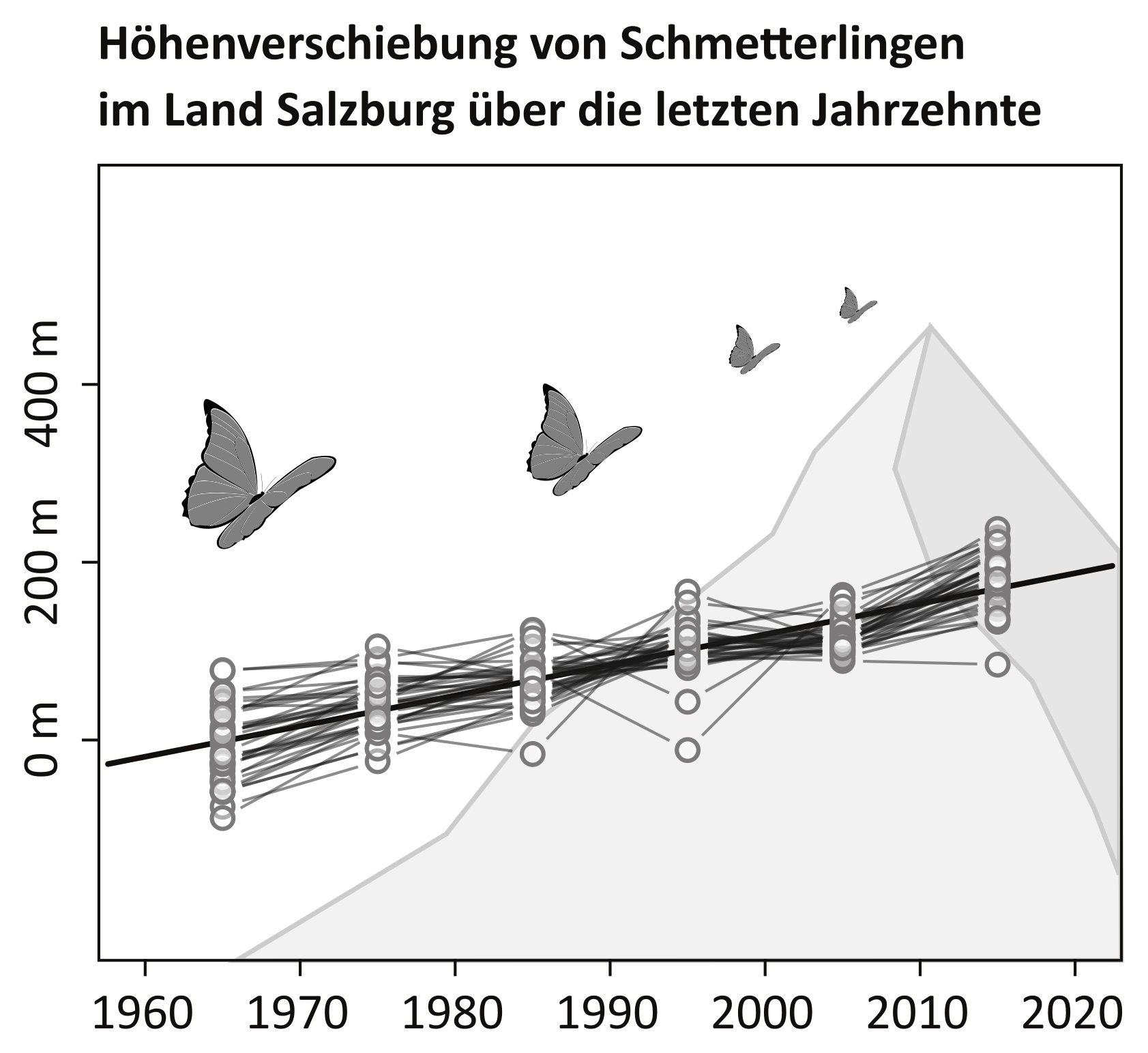 Das österreichisch-polnisch-deutsche Team hat hierfür historische Aufzeichnungen von 5836 Tagfalterbeobachtungen aus den Datenbanken des „Hauses der Natur Salzburg“ mit hochauflösenden Klimadaten von der Zentralanstalt für Meteorologie und Geodynamik Salzburg korreliert und so die Verbreitungsgebiete der Tiere im Zeitraum 1960 bis 2019 analysiert. „Unsere Daten zeigen, dass sich die Lebensräume der Schmetterlinge des Salzburger Landes seit mehreren Jahrzehnten in höhere Lagen verschieben“, erläutert Erstautor Dr. Dennis Rödder vom Leibniz-Institut zur Analyse des Biodiversitätswandels (Museum Koenig) in Bonn die Ergebnisse. Im Schnitt konnten die Forscher eine Verschiebung der Verbreitung der Gebirgs-Tagfalter um etwa 300 Meter bergaufwärts innerhalb von nur 60 Jahren nachweisen.