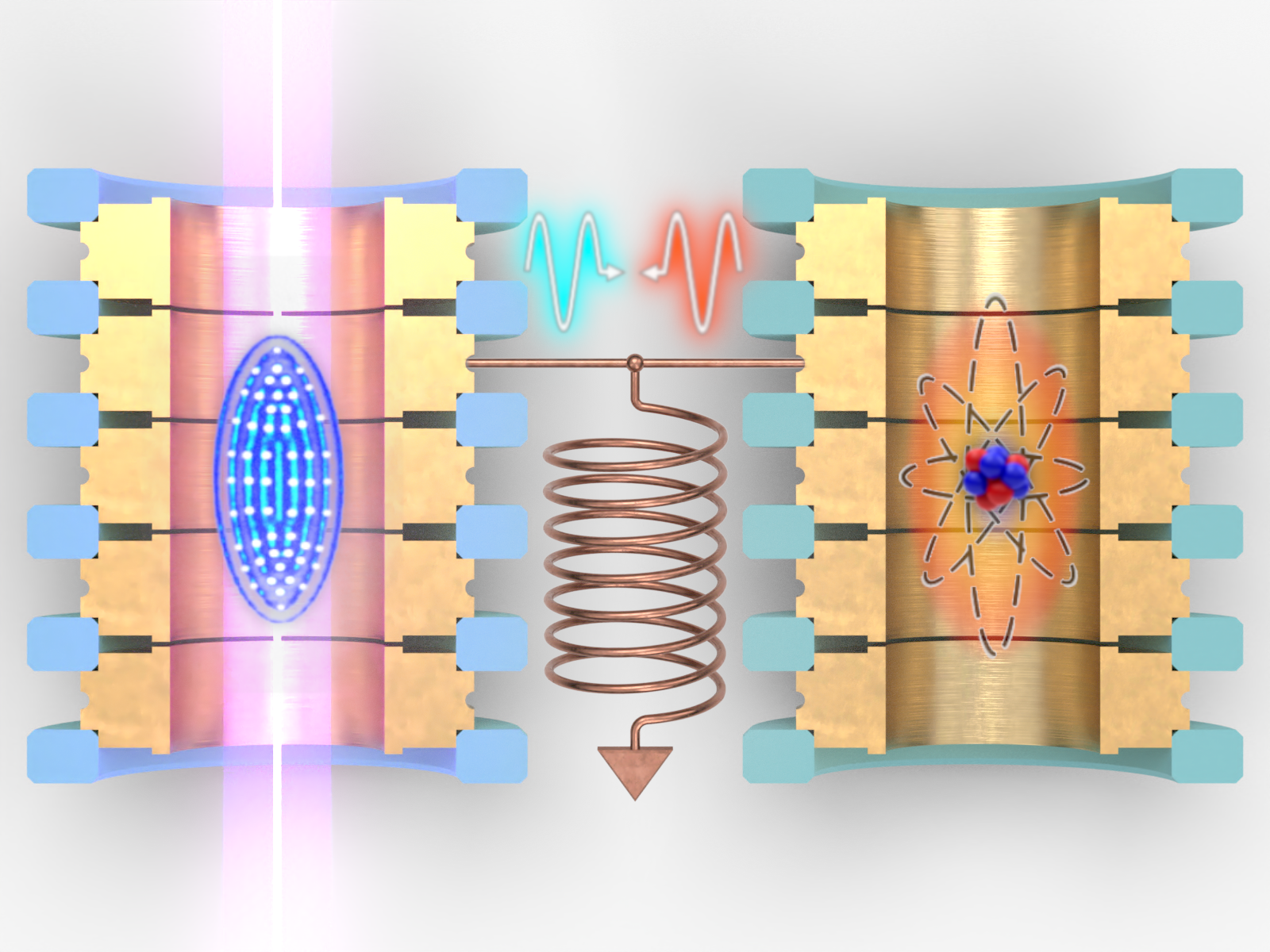 The new method proposed by the MPIK scientists is based on the idea to resonantly enhance the coupling strength via an auxiliary resonator circuit. Using the picture given above, Sven Sturm explains the effect: “It’s like adding an oscillating weight in the middle of the spring linking the two children’s swings. When the oscillation frequencies of the ions (kids) are similar to the resonator’s, the resonator (the oscillating weight) starts to oscillate as well and thus enhances the coupling drastically. However, as the ions get colder than the resonator, it starts heating the ions and limits the achievable temperature.”